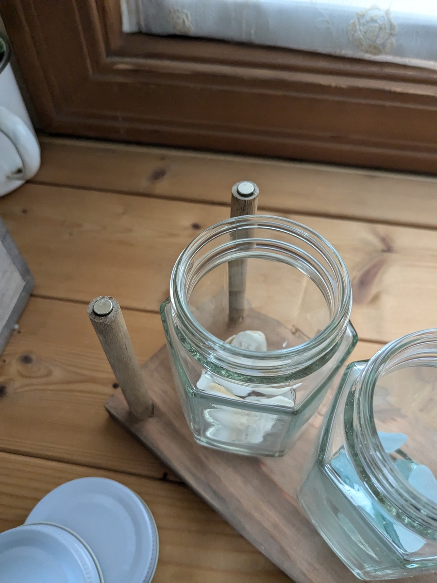 トップ > DIY > インテリア > ホールソーで瓶ホルダー nohashi 2024/10/01 11:07 ホールソーで瓶ホルダー 先月初めにホームで作りました。 事前に先生には丁番で開けしめできるようにしたいので固定しないで持ち帰りと打ち合わせ済。 ホールソーで穴あけてふちをヤスリ、ダボ穴2つ目開けてたらミシミシって木の目に沿って板が割れ😱😱😱 はい、最初からやりなおし〜ってことになったけど無事時間内に終了👍 帰ってから丁番をつけて ダボには磁石とブリキ板を仕込んで終了。 いいね 共有する 共有する X LINE リンクをコピー コメントする 1 件の返信 (新着順) ミュートしたユーザーの投稿です。 投稿を表示 coco⭐️ 2024/10/01 16:20 丁番を付けるアイデア良いですね! 飾る物によって雰囲気も変わりそう🥰 いいね 返信する ミュートしたユーザーの投稿です。 投稿を表示 nohashi 2024/10/01 16:41 coco⭐️ 見本見た時から瓶を取り外せるようにしたくて😅 いいね 返信する ミュートしたユーザーの投稿です。 投稿を表示 coco⭐️ 2024/10/01 20:14 nohashi 蓋が取りたずせたら便利ですよね!😆 いいね 返信する ミュートしたユーザーの投稿です。 投稿を表示 nohashi 2024/10/01 20:16 coco⭐️ そうなんですよ😊 いいね 返信する