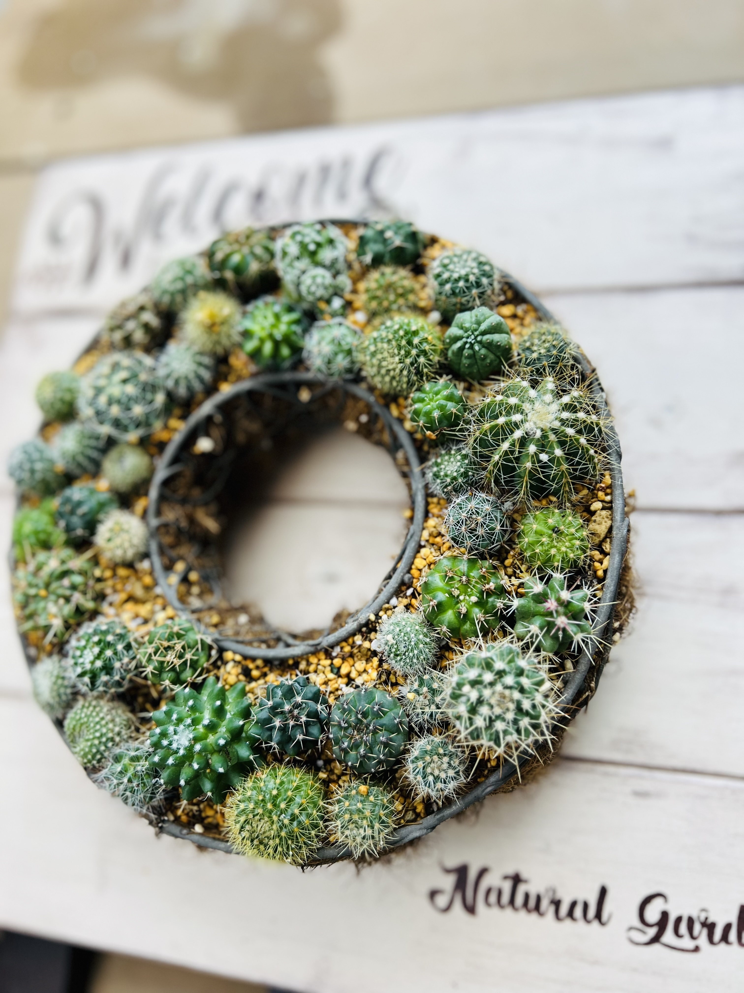 投稿を表示コロコロいっぱいで可愛いです🌵落ちないのは固まる土(砂)でしょうか🤔サボテンをリース型に植えるのもいいですね。