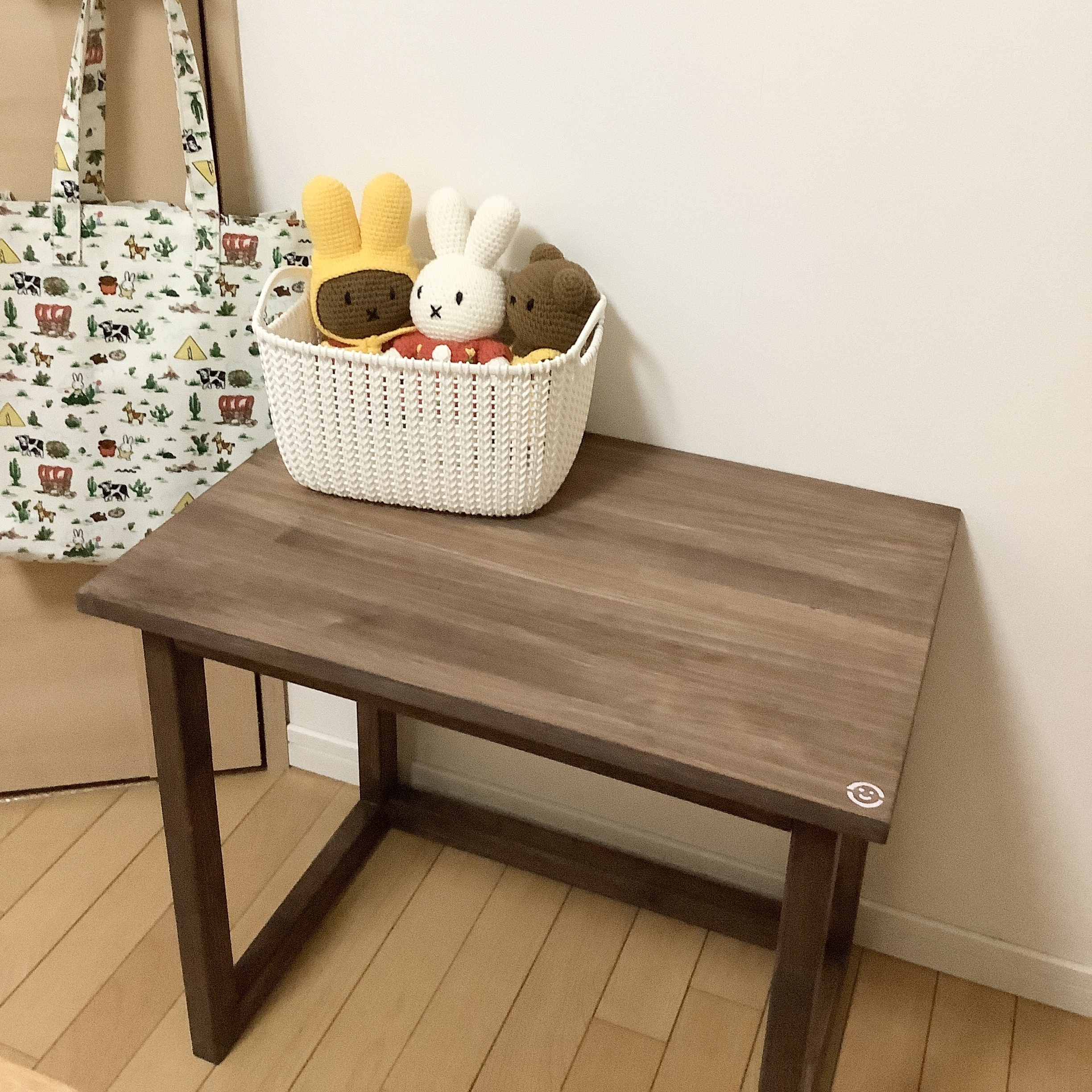 投稿を表示天板のお色、木目が綺麗に出ていて素敵〜😊💕イスもお揃いで作りたくなりますよね。ニコちゃん可愛いわ🤭✨