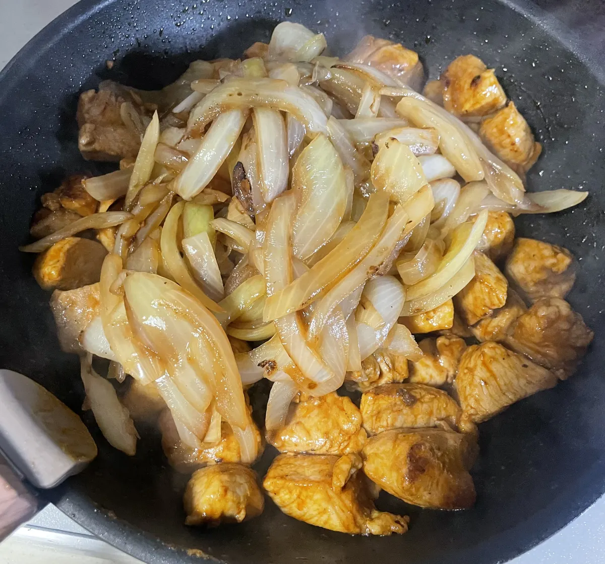 焼き目が付いたら玉葱と合流ぅ〜😁👍🐖🤝🧅✨