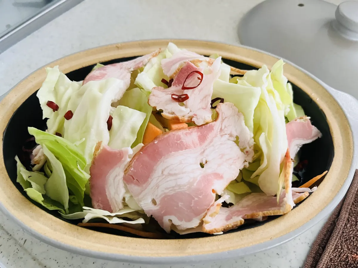 投稿を表示たっぷりなお野菜と、上に乗ったベーコンに食欲をそそられます😋