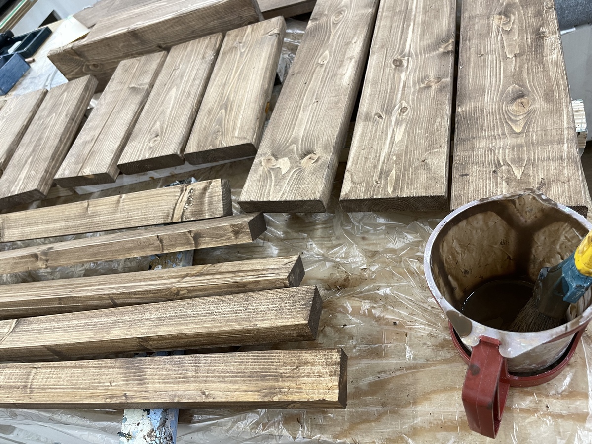 最初に木材の色塗りからスタート!