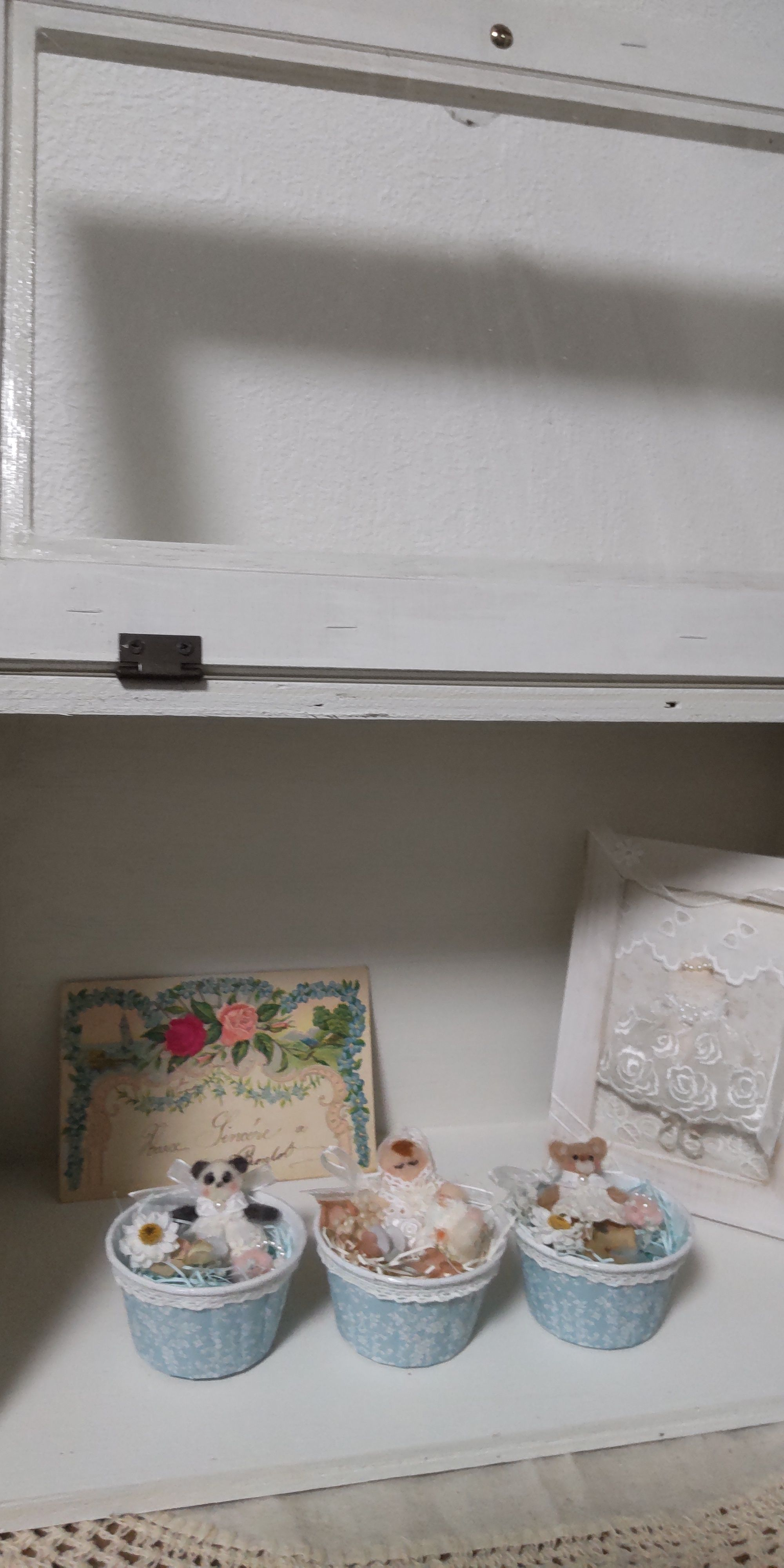 投稿を表示おお〜、ベビちゃん達かわいいですね〜。白いカフェ風ショーケースの中で安心してねんねしてますね〜