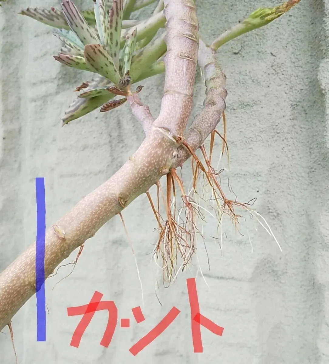 1.伸び上がった親株の途中(茎と葉の境)に根っ子が這えたので、根っ子から上部と、落ちて育った子も一緒に植え付けました。