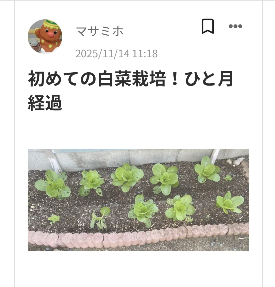 トップ > 秋冬家庭菜園2025 > キャンペーン > 初めての白菜栽培!2ヶ月経過 マサミホ 2025/12/10 12:51 初めての白菜栽培!2ヶ月経過 ■育てた野菜 白菜 白菜を育てて約2ヶ月が経過しました。未だに私の知ってる白菜とは程遠い感じです。 そろそろお鍋の美味しい季節になって来たのにぃ。。。 上の写真はひと月前の様子です。 先月と比べると大きくはなってますので成長はしてるケドぉ。。。 農家さんの凄さに改めて感じさせられますね。 ■エピソード テムおじさんから45日で食べられるから植えてみてと言われましたが、ん。。。無理でしたね。笑 はじめてチャレンジ部門_秋冬家庭菜園2025 いいね 共有する 共有する X LINE リンクをコピー コメントする 4 件の返信 (新着順) ミュートしたユーザーの投稿です。 投稿を表示 さくら♡ 2025/12/11 23:17 なんか葉牡丹みたいで、可愛いです💕 このままでも美味しそう💕 いいね 返信する ミュートしたユーザーの投稿です。 投稿を表示 ダンボ 2025/12/11 22:39 大切に育ててくださいね! いいね 返信する ミュートしたユーザーの投稿です。 投稿を表示 toshi 2025/12/11 08:45 だいぶ育って来ましたね これは楽しみですね😊 いいね 返信する ミュートしたユーザーの投稿です。 投稿を表示 マサミホ 2025/12/11 12:25 toshi ん。。。食べるまで行かないかも知れませんね。 いいね 返信する ミュートしたユーザーの投稿です。 投稿を表示 toshi 2025/12/11 12:29 マサミホ せっかく葉が育っているのですからそれを食べてみるなんてどうでしょう 他の野菜ですが間引き菜として食べると美味しかったです😊 いいね 返信する ミュートしたユーザーの投稿です。 投稿を表示 マサミホ 2025/12/11 16:26 toshi なるほどですね(^^)/もう少し成長してから頂こうと思います(^^ゞ いいね 返信する ミュートしたユーザーの投稿です。 投稿を表示 toshi 2025/12/11 17:03 マサミホ 自分も来季は絶対に白菜育てたいと思います すいません白菜育てたことないのに😊 いいね 返信する ミュートしたユーザーの投稿です。 投稿を表示 チコリ 2025/12/11 01:55 確実に大きくはなってますけど、どうしたんでしょうね🤔 いいね 返信する ミュートしたユーザーの投稿です。 投稿を表示 マサミホ 2025/12/11 12:24 チコリ やはり寒いと育ちが悪い見たいですね。完全に植え付け時期が遅かったかも知れませんね💦 いいね 返信する