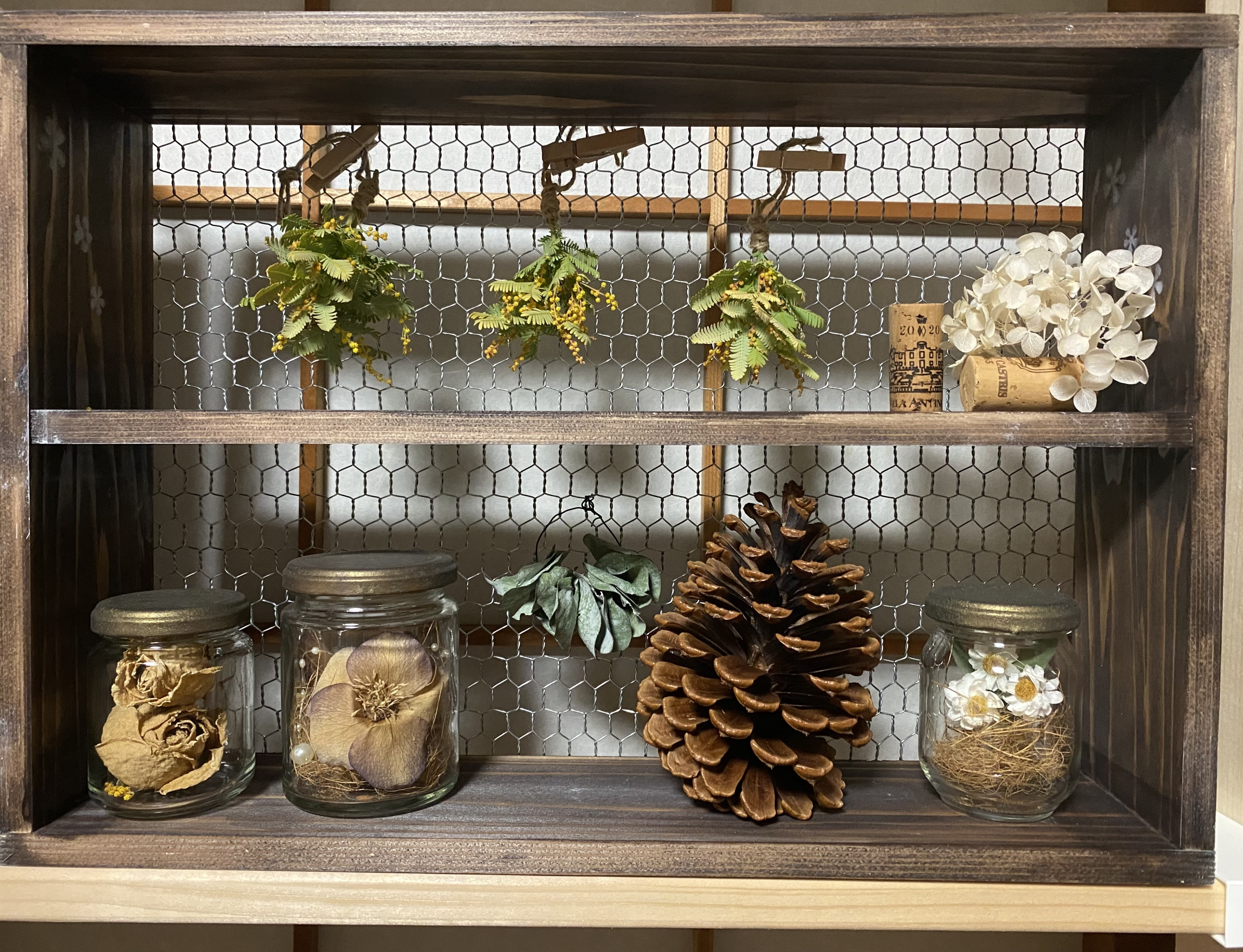 トップ > ワークショップ > 棚・収納 > チキンネットでアンティーク風ディスプレイ棚 初心者 2026/02/16 18:29 チキンネットでアンティーク風ディスプレイ棚 先週WSで作ったチキンネットでアンティーク風ディスプレイ棚にミモザのミニスワッグを飾りました✨ミモザはまだ蕾ですがフライングでカットしてきました🤭蕾でもかわいいですよね🌼ドライフラワーをつめた空き瓶もいろいろ飾ってみました🫙 いいね 共有する 共有する X LINE リンクをコピー コメントする 4 件の返信 (新着順) ミュートしたユーザーの投稿です。 投稿を表示 yuco 2026/02/17 08:50 初心者さん、これは何色の塗料を塗られたんですか? 私も来月、このWS予約取れたんです ブラウン系も素敵ですね✨✨ ミモザ、咲くの楽しみですよね〜 いいね 返信する ミュートしたユーザーの投稿です。 投稿を表示 初心者 2026/02/17 20:06 yuco ありがとうございます😊 今回はダークブラウンで塗装しました🎨アンティーク加工はあまりうまくできていませんが😅時々ダークブラウンもいいなぁって思います✨ 来月楽しみですね🎵 いいね 返信する ミュートしたユーザーの投稿です。 投稿を表示 yuco 2026/02/17 20:47 初心者 ダークブラウンで塗られたのですね 素敵ですね〜😊 教えて下さってありがとうございます💕 いいね 返信する ミュートしたユーザーの投稿です。 投稿を表示 初心者 2026/02/17 22:24 yuco いえいえ☺️ ステンシルも一面だけできるので楽しみですね😊ステキな作品の投稿楽しみにしています♪ いいね 返信する ミュートしたユーザーの投稿です。 投稿を表示 ちーず 2026/02/17 07:47 ステキ〜✨ あまりに素敵なので、私も作れば良かったなぁー。と思っちゃいました😆 いいね 返信する ミュートしたユーザーの投稿です。 投稿を表示 初心者 2026/02/17 20:02 ちーず ありがとうございます😊 棚の高さも自由なので飾るものに合わせて作れますね👍偶然、大きな松ぼっくりがはいりました😄 機会あれば作ってみてくださいね いいね 返信する ミュートしたユーザーの投稿です。 投稿を表示 mi 2026/02/16 21:57 勉強になります👍✨ 来週作ってきます😆 いいね 返信する ミュートしたユーザーの投稿です。 投稿を表示 初心者 2026/02/17 19:59 mi 作業はめちゃ簡単でした🛠️ネットの取り付けがちょっとだけ大変だったかな😅頑張ってステキな棚を作ってください✨ いいね 返信する ミュートしたユーザーの投稿です。 投稿を表示 ラムちゃん 2026/02/16 19:57 可愛くディスプレイされてて 素敵💓 わたしはただ出来上がったビン🫙を 入れ込んでるだけで🤣💦 リメイクしたビン🫙と このチキンネットが またよく合うよね〜💓 いいね 返信する ミュートしたユーザーの投稿です。 投稿を表示 初心者 2026/02/17 19:57 ラムちゃん ありがとうございます😊 せっかくのネットなのでぶら下げてみました💐このサイズ瓶🫙を並べるのにピッタリですね✨またいろいろ並べて楽しみたいと思います🎶 いいね 返信する
