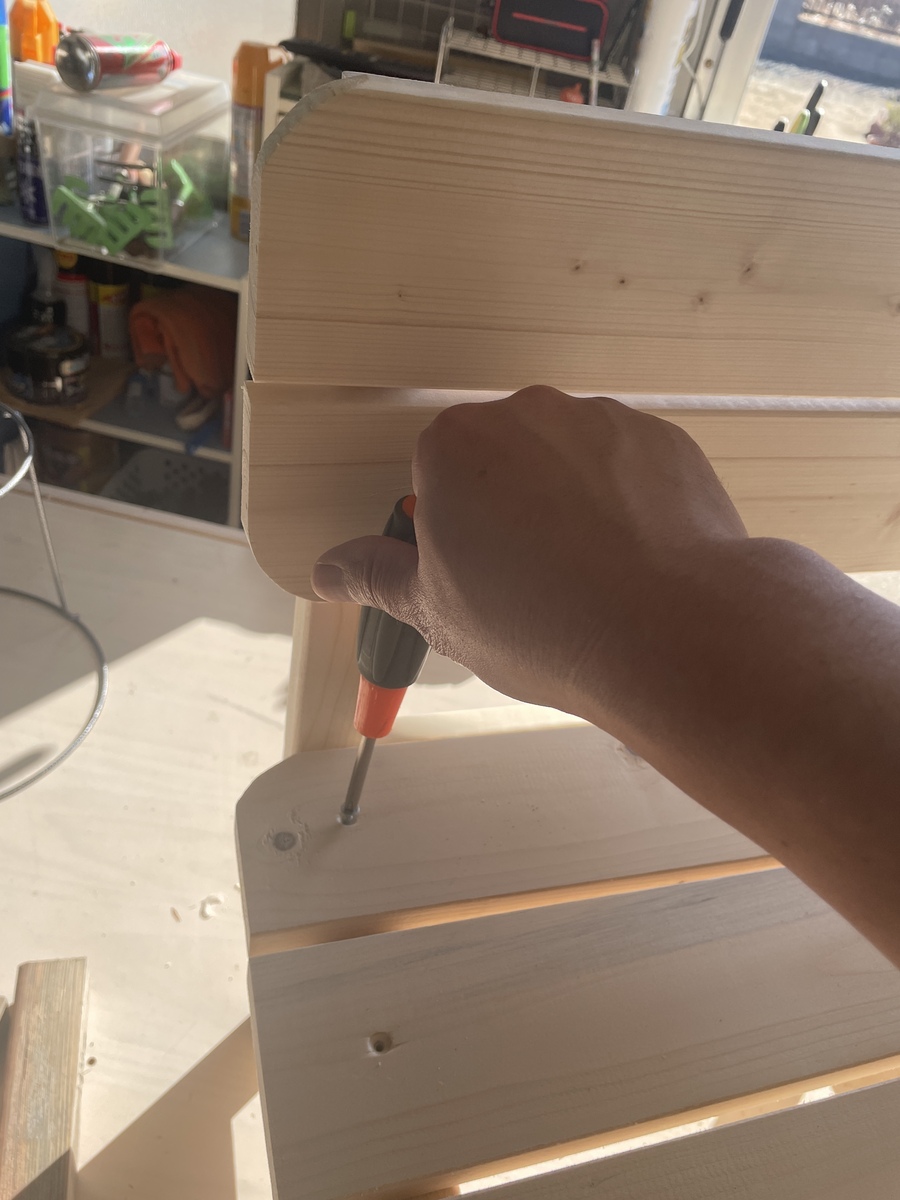 初めにネジを板に組付けて柱の元の穴位置に合わせてからねじ止めしました。