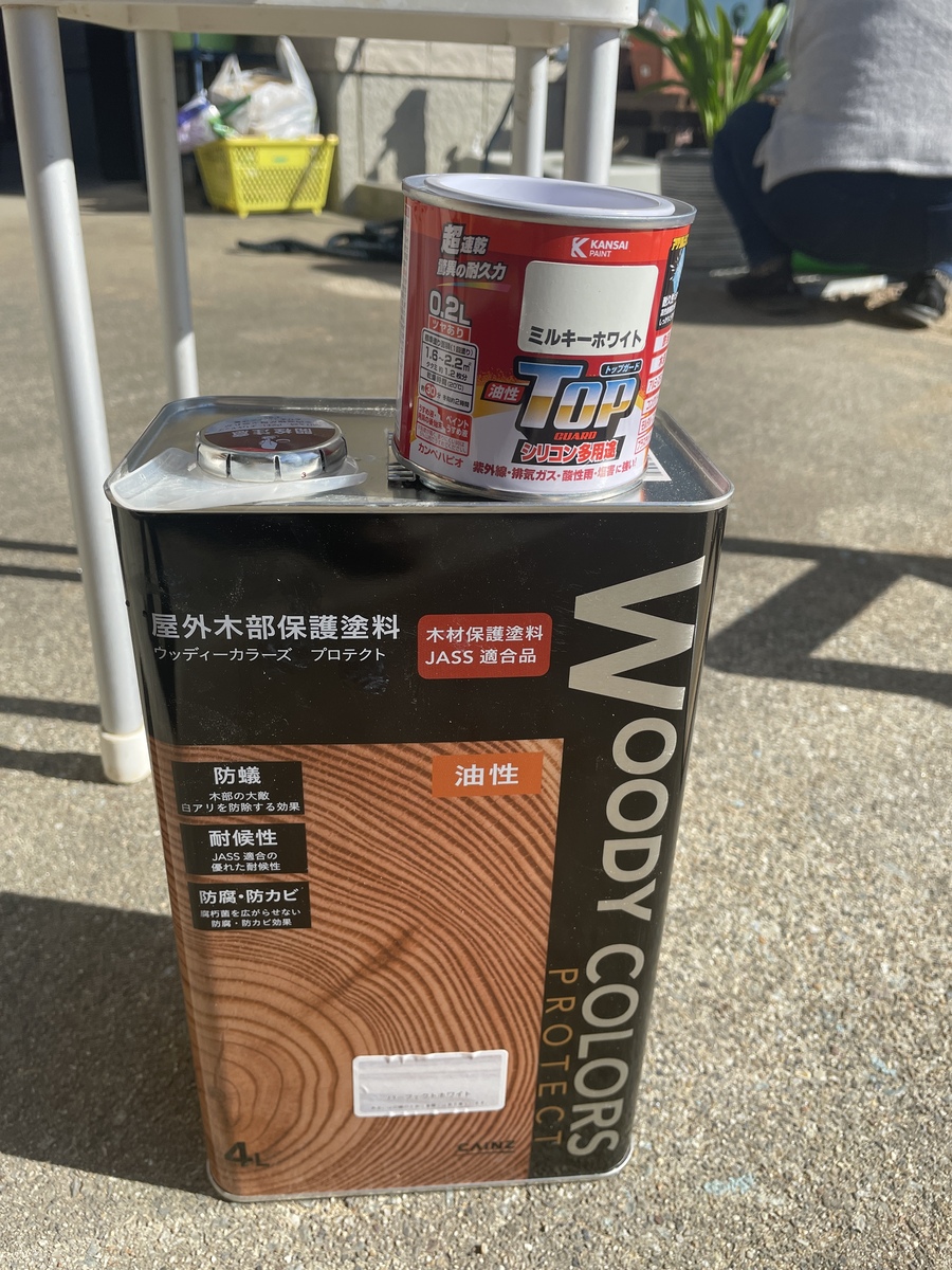 こちらは先日購入したカインズさんのオリジナル塗料ウッディーカラーズのホワイト塗料です。