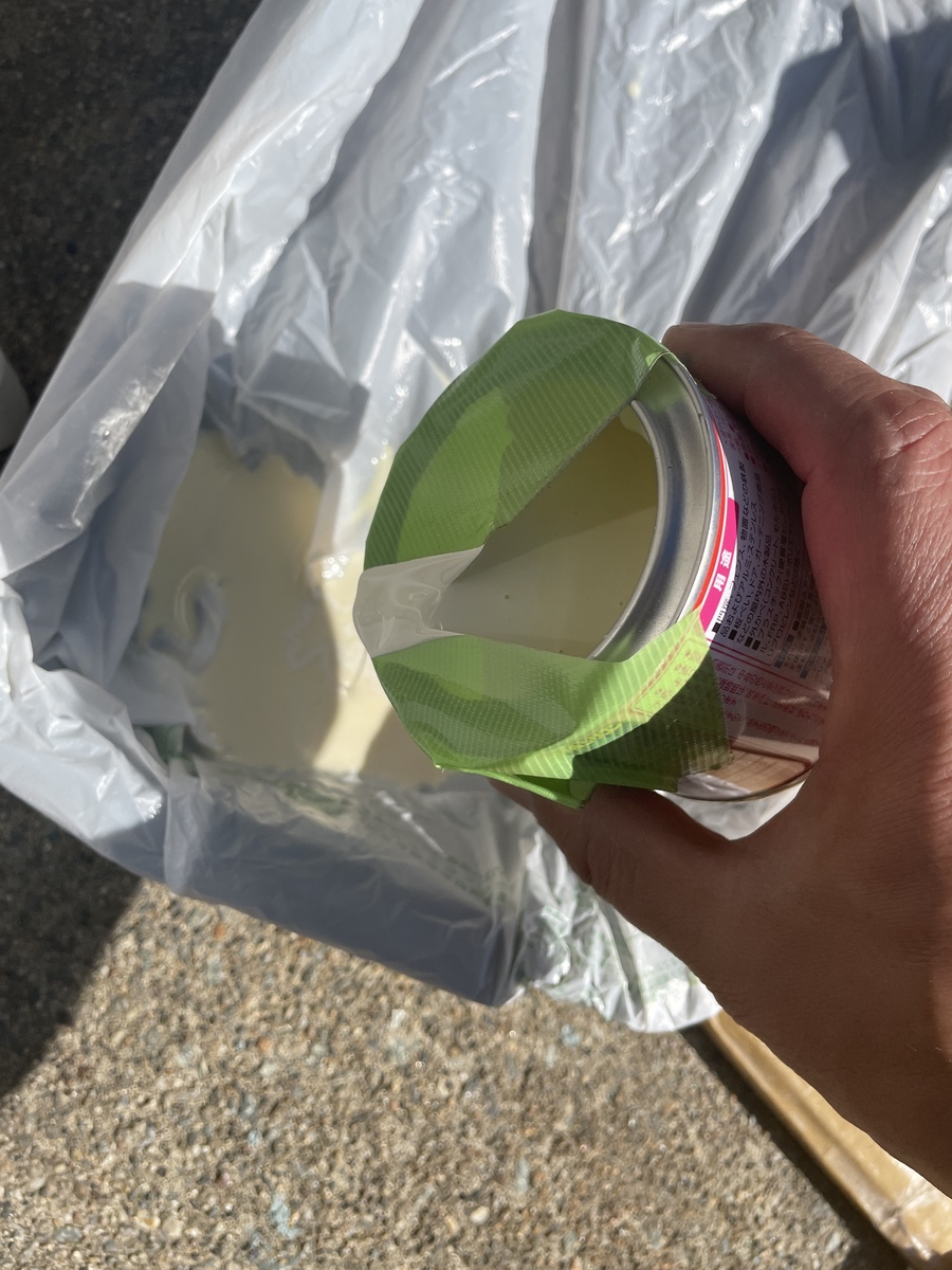 こちらの缶は注ぎ口が付いていないのでマスキングテープで注ぎ口を作ってます。