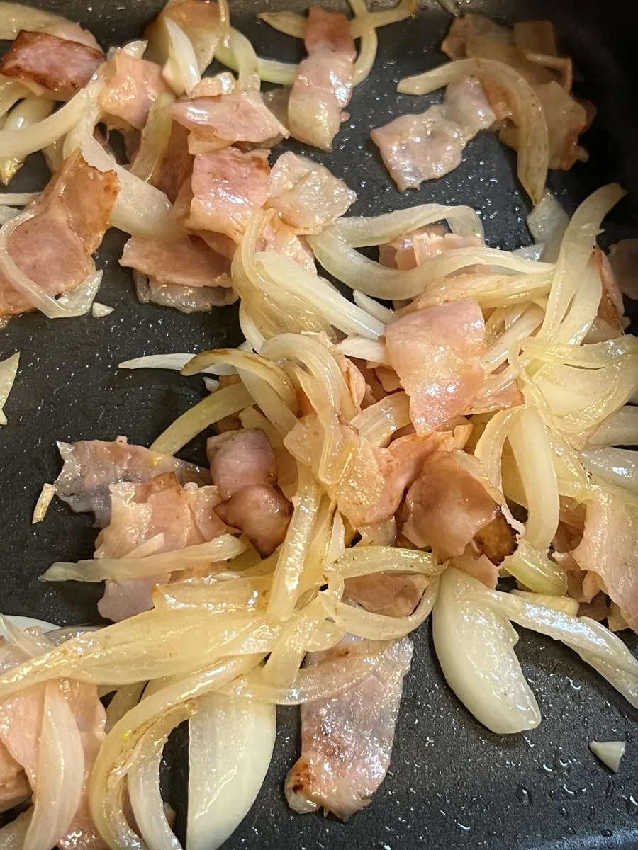 ③フライパンにニンニクとサラダ油を熱して、香りが出たらベーコン、玉ねぎの順に炒める。