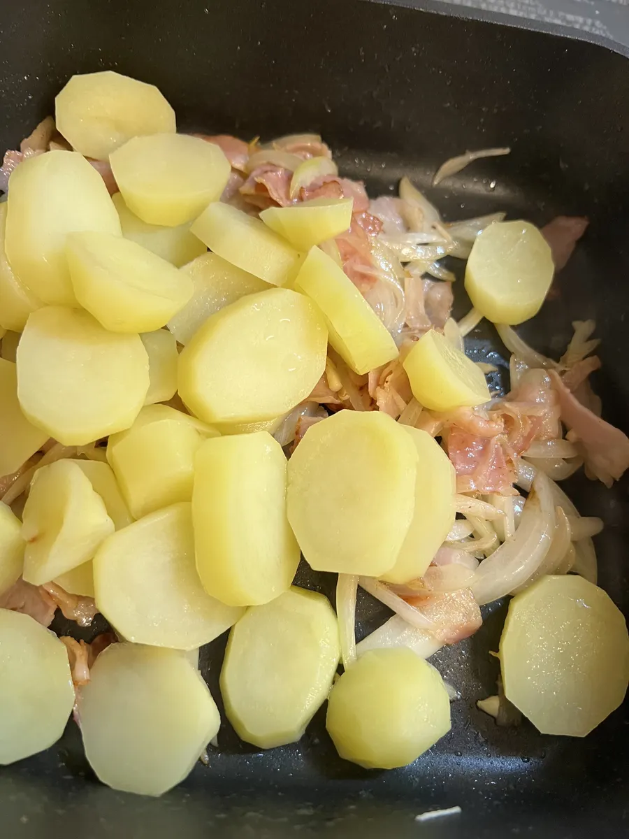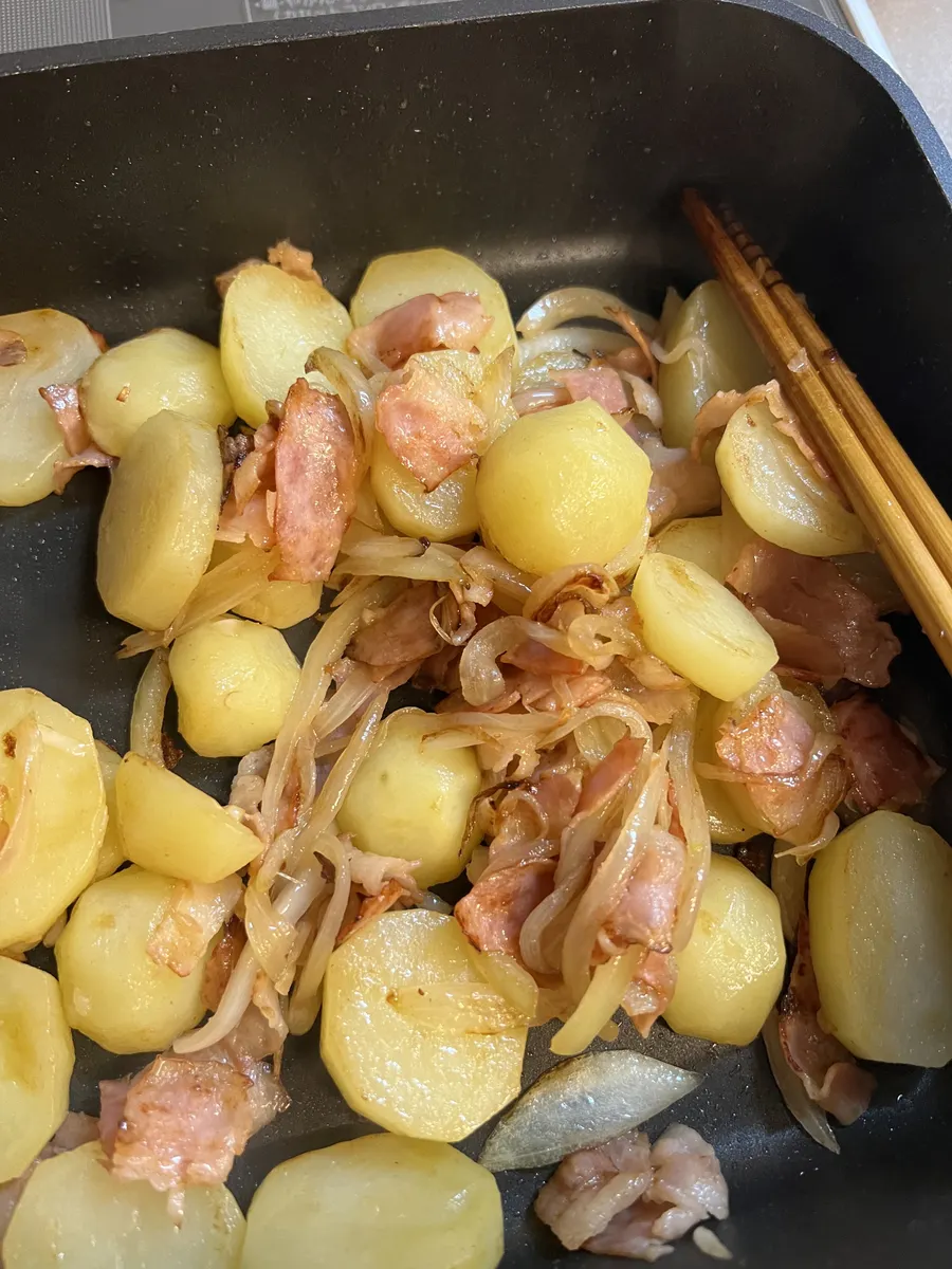 ④玉ねぎがしんなりしてきたら①のじゃがいもを入れて焼き目がついてきたらコンソメとブラックペッパーを足して出来上がり。