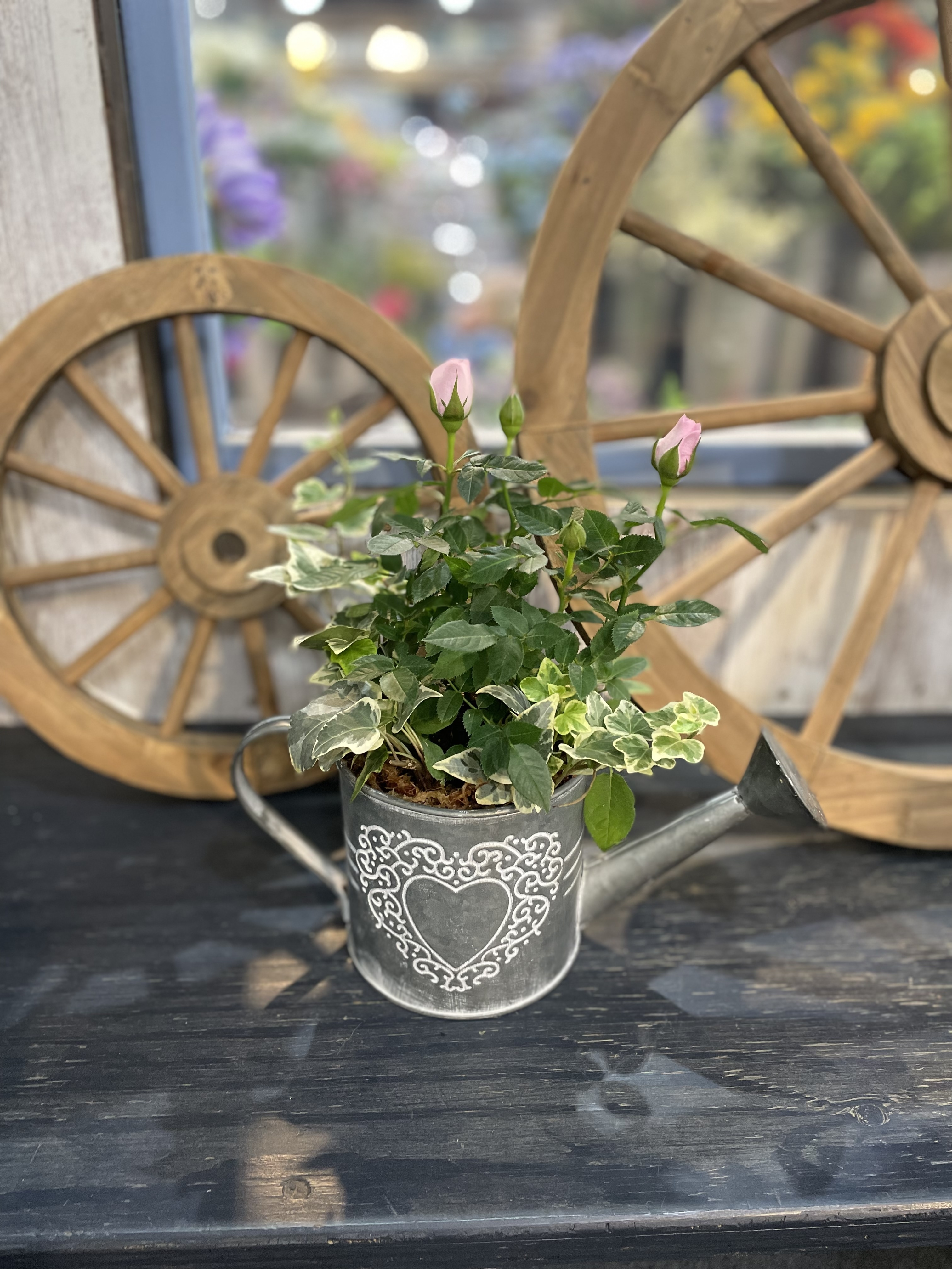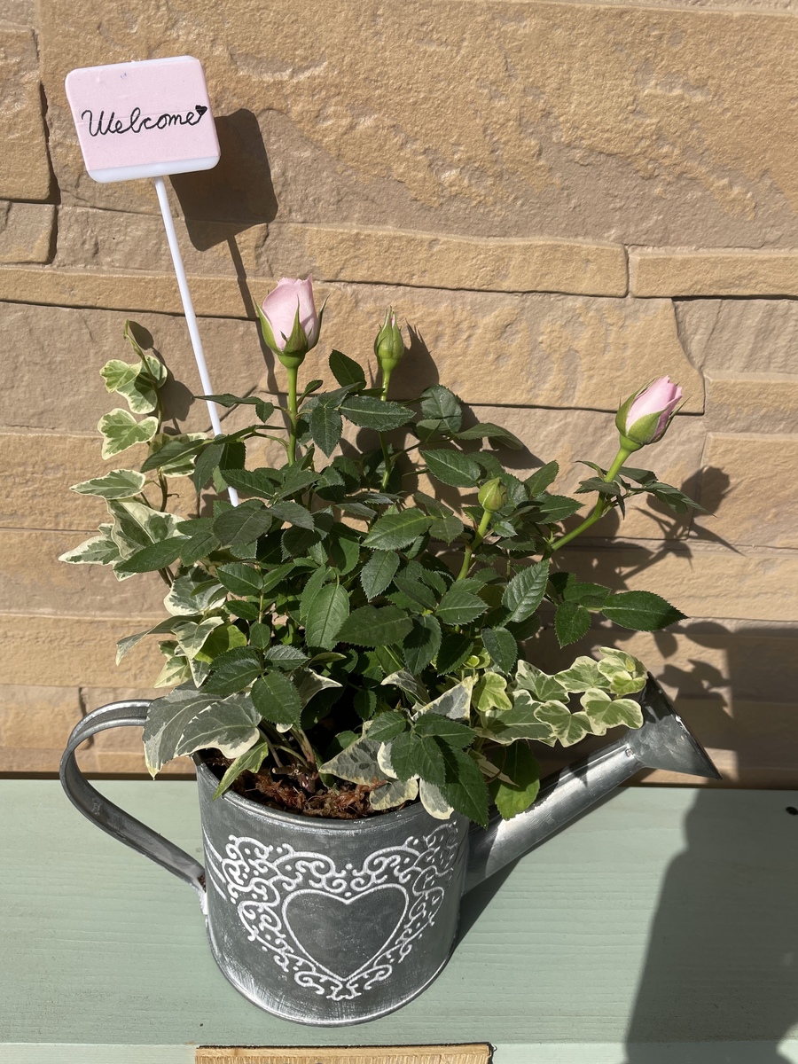 投稿を表示ブリキのジョーロに可愛らしい小さなバラがぴったりです💕予約の空き待ち頑張った甲斐がありましたね👍