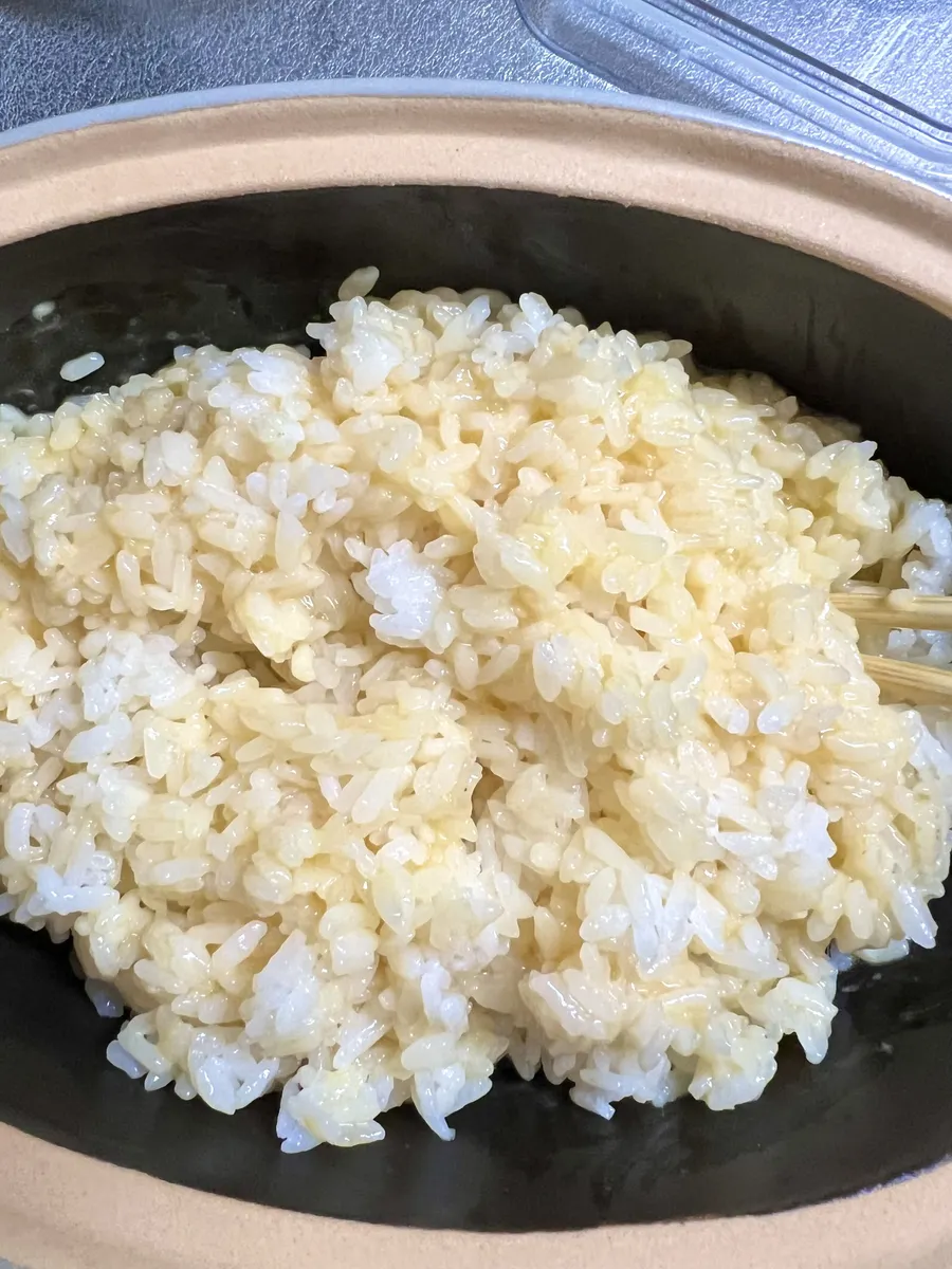 ①ご飯にマヨネーズを入れて溶いた玉子、ごま油、鶏がらスープを入れてよくかき混ぜる。