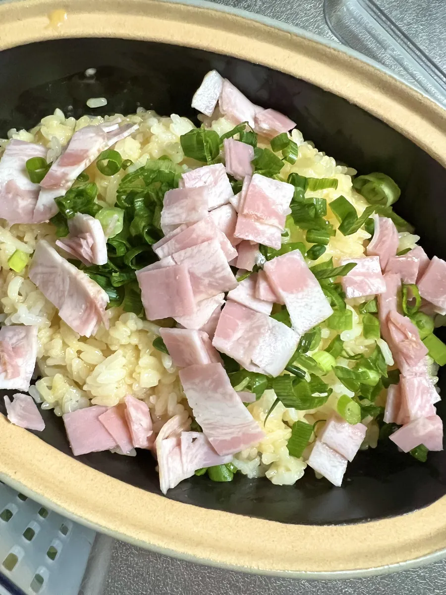 ②上にネギやハムなどを乗せてフタをしてレンジで2分半。一旦取り出して醤油を回しかけてフタ無しで1分。