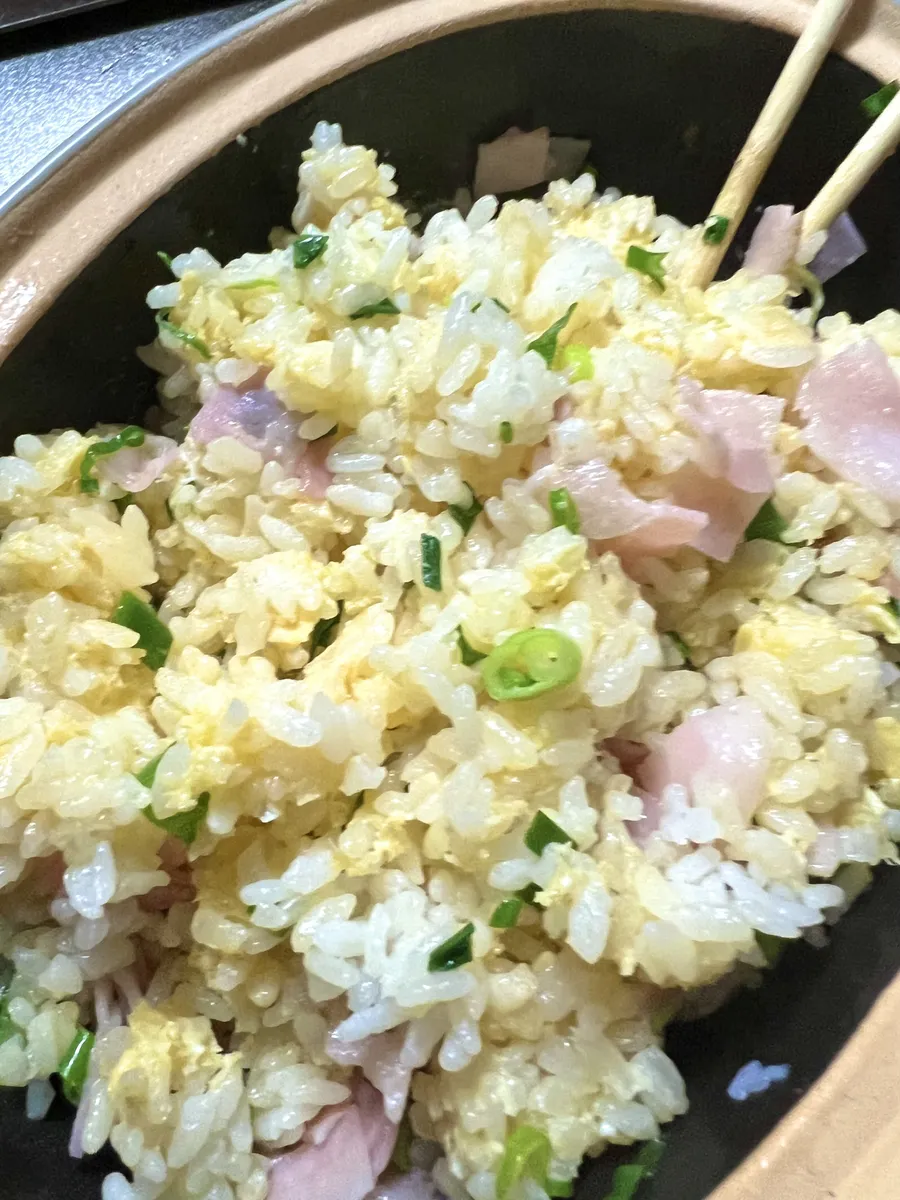 ご飯にマヨネーズを溶いた玉子をまとわせることがポイントです❣️ちゃんとパラパラに😊