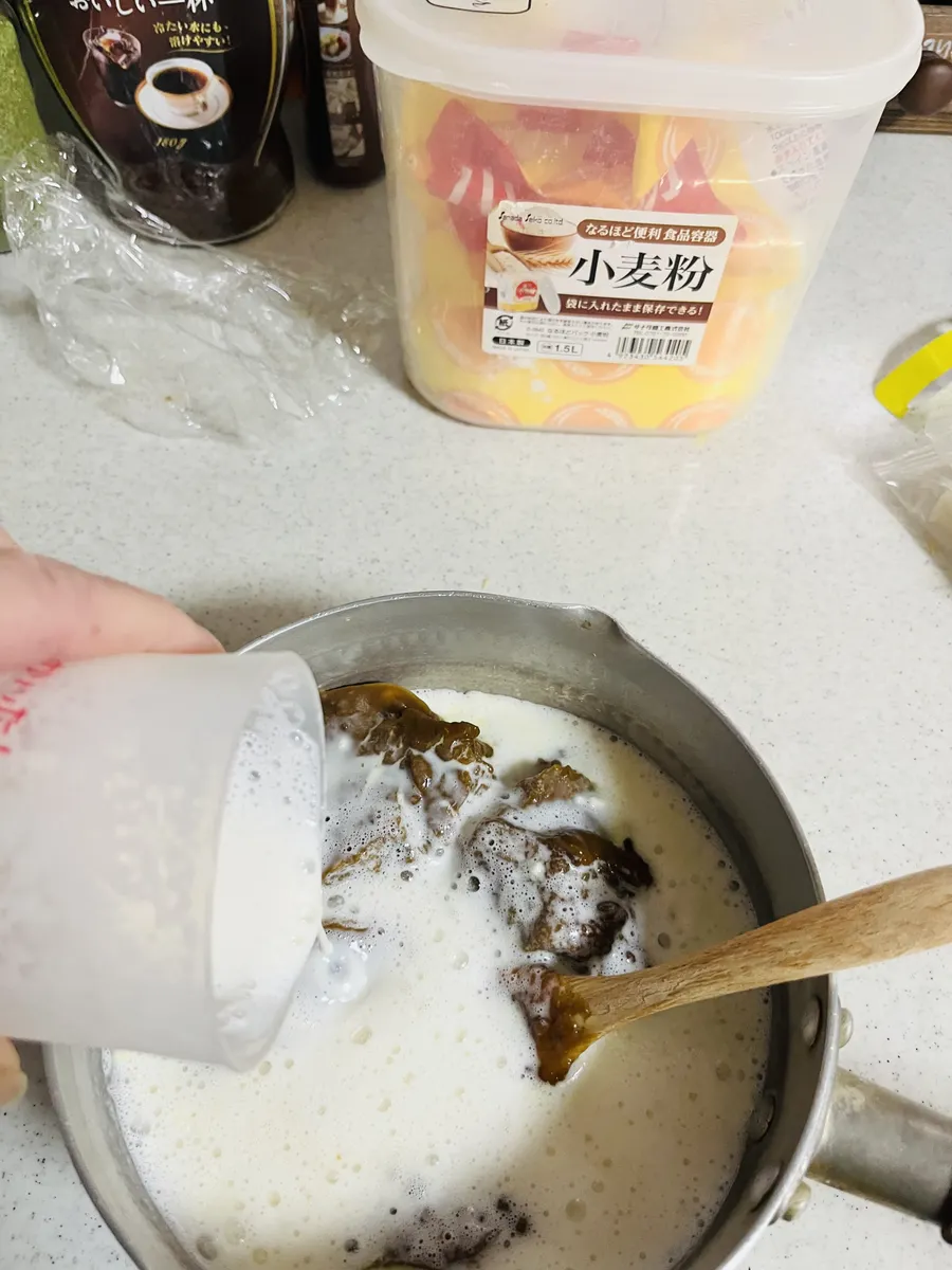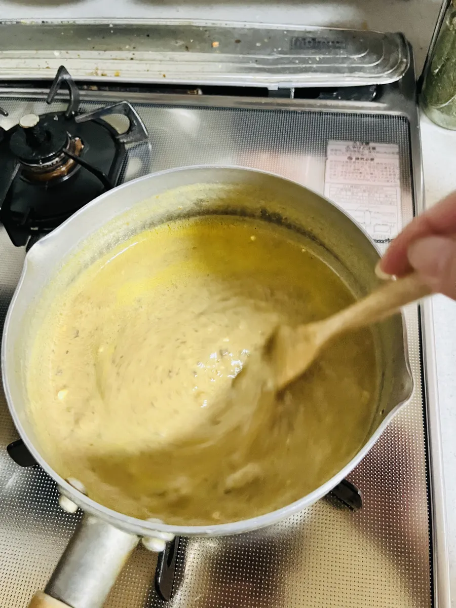 豆乳or牛乳に小麦粉1杯とコンソメ少々を混ぜ混ぜ👍