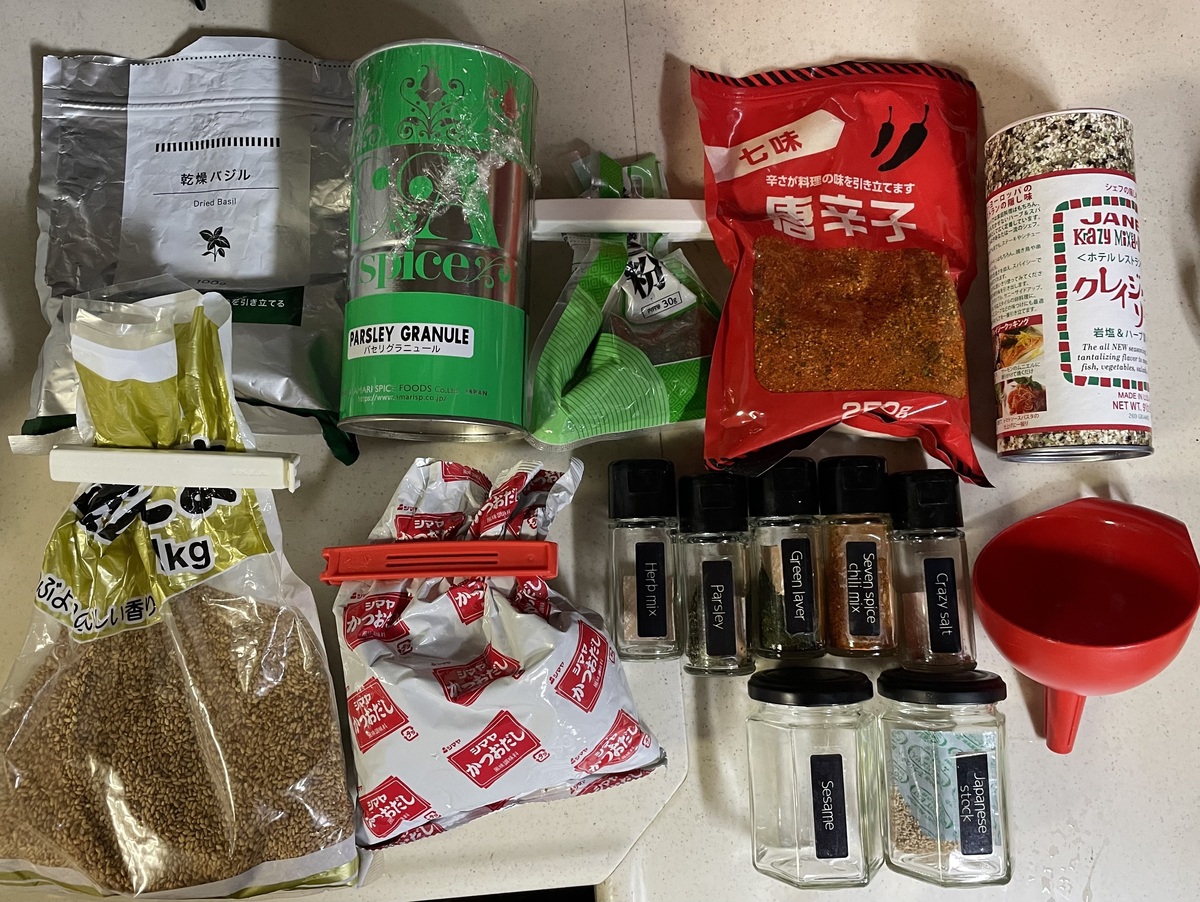 蓋の色とか、形で何のスパイスか覚えてるから、瓶を統一したら多分とんでもない事になっちゃうだろうなぁ。