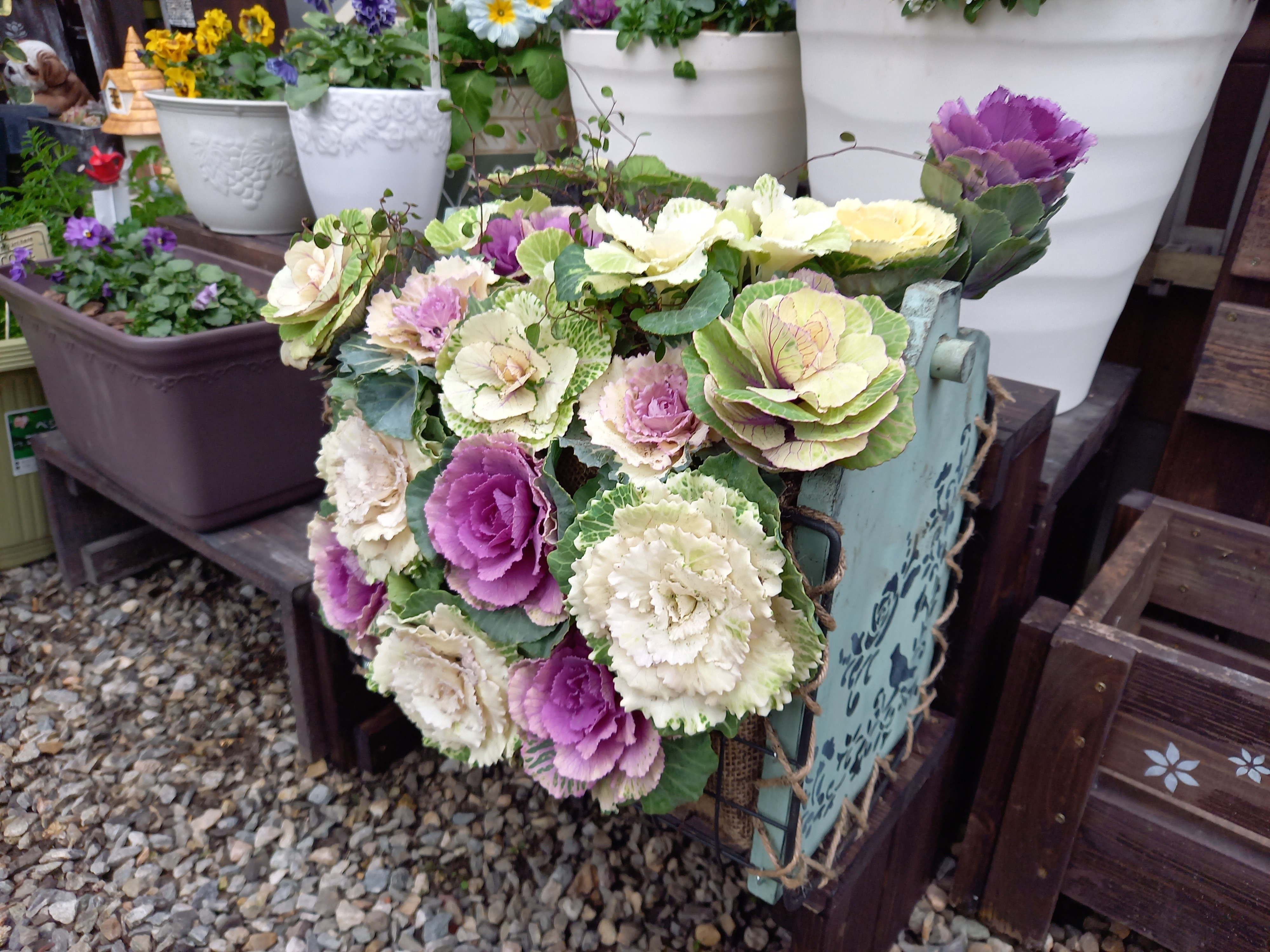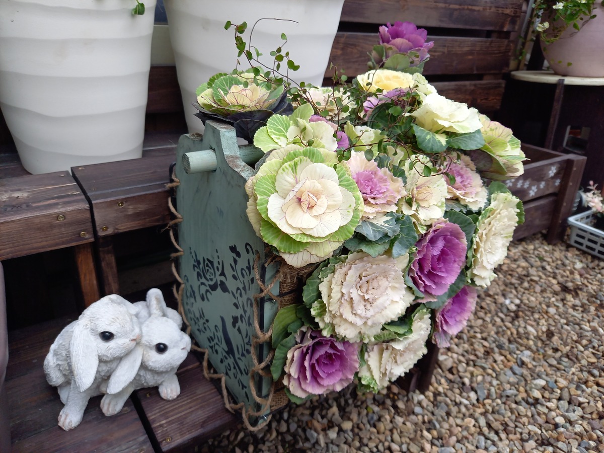 投稿を表示凄ーい!!✨💕カッティングボードバスケットに葉牡丹寄せ植えって初めて見るかも😳✨