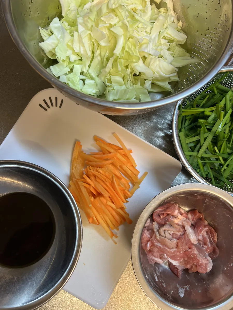 ③野菜を全て細切りに切っておく。