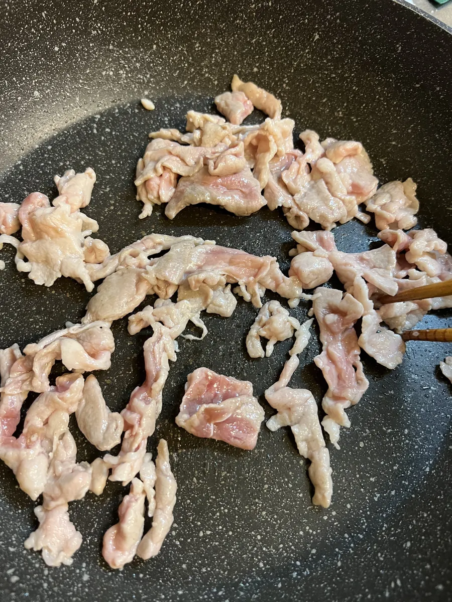 ④フライパンにサラダ油を熱し、豚肉を炒めて、火が通ったら取り出しておく。
