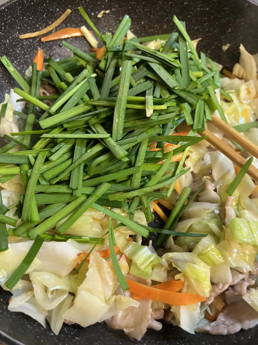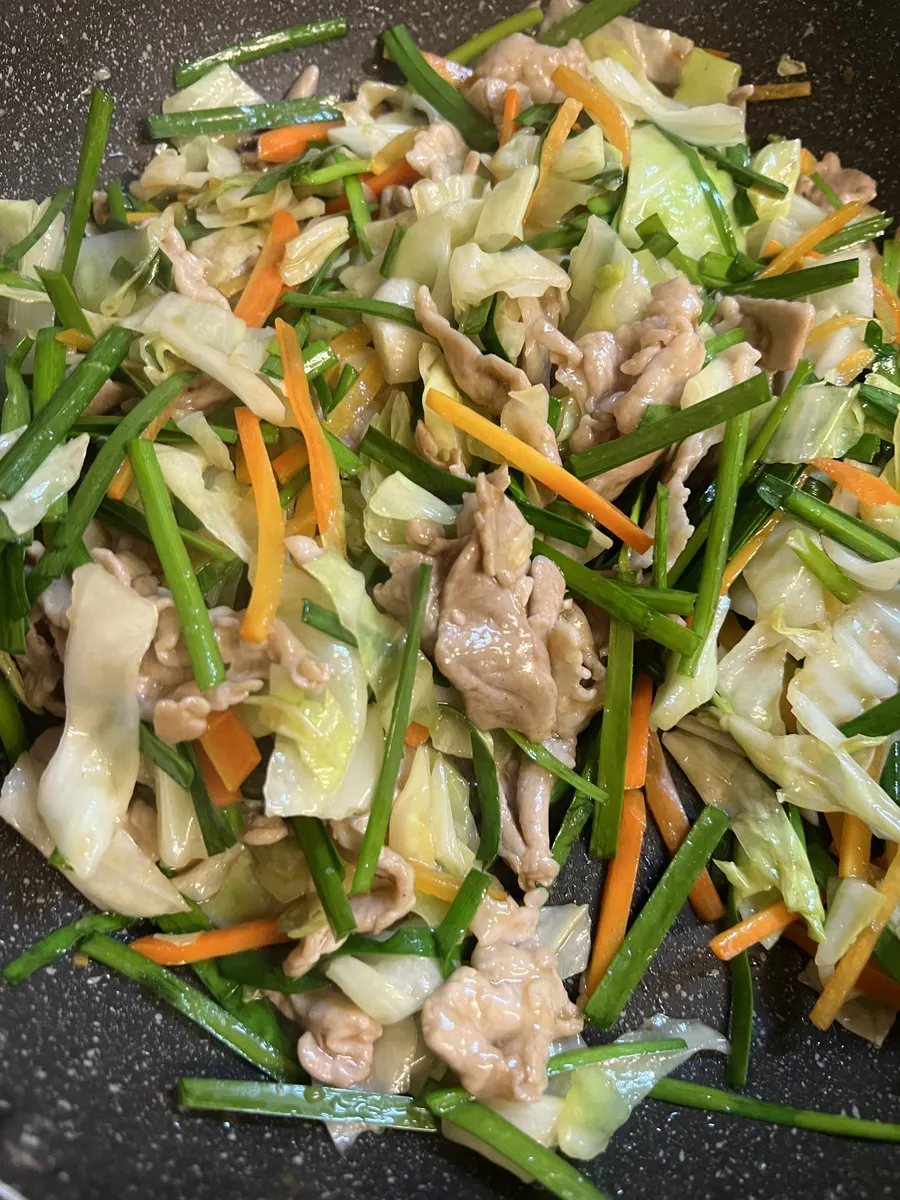 ⑤サラダ油を足し、火の通りにくい野菜から順に炒めていき、しんなりしてきたら、豚肉を戻して合わせ調味料を入れて手早く炒めニラを足してサッと炒めたら出来上がり♡