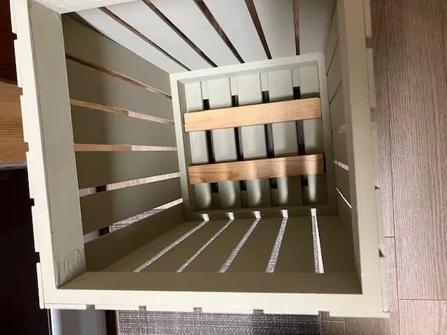 そこで、我が家の廃材の中から3センチ角の角材を25㎝に切り、2本用意して底面に設置して底上げ。