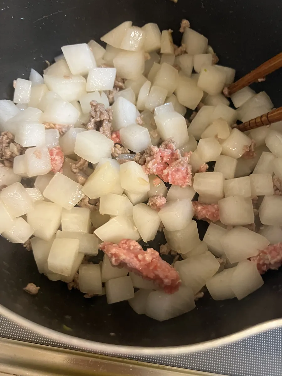 ②鍋にサラダ油またはオリーブオイルを熱し、塩少々、ニンニクを加えて大根を透き通るまでじっくりいためる。