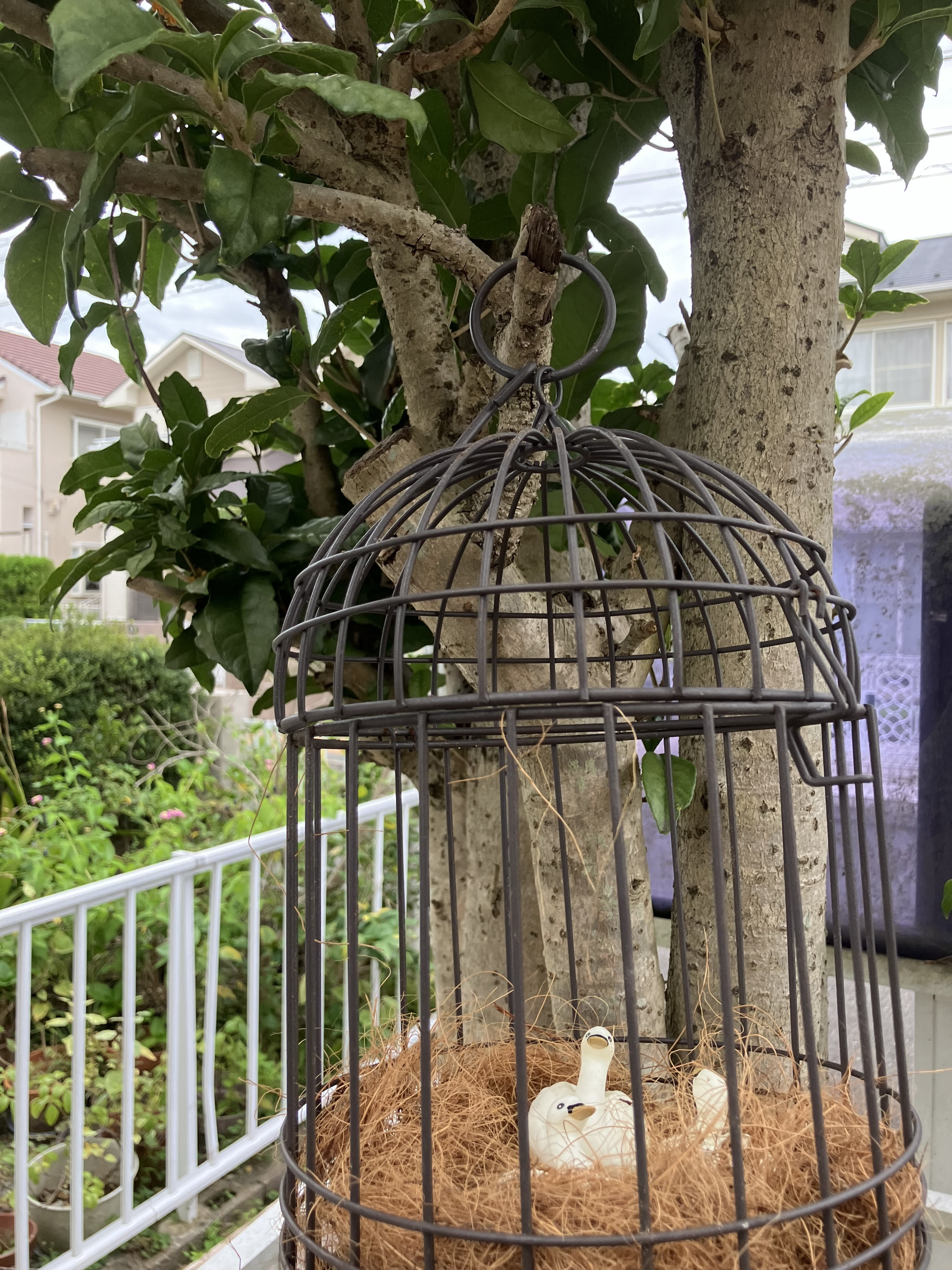 投稿を表示鳥籠の寄せ植えを解体し、鳥いれて、金木犀に引っ掛けた^_^ 唐辛子とマーガレット並べない方がいいのかな。