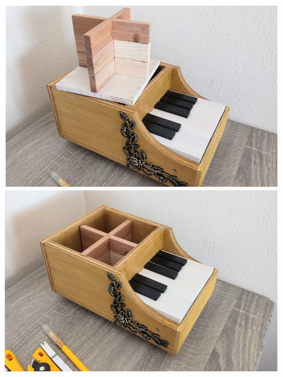 端材で中を4つに区切りました。後々、使い方が変わることがあるかもしれないので、区切りの板は取り外せるようにしました。筆やペンなど、種類毎に立てて入れることができました。小さいカッターやピンセットは、行方不明になることが多いので、これからはちゃんとしまおうと思います。