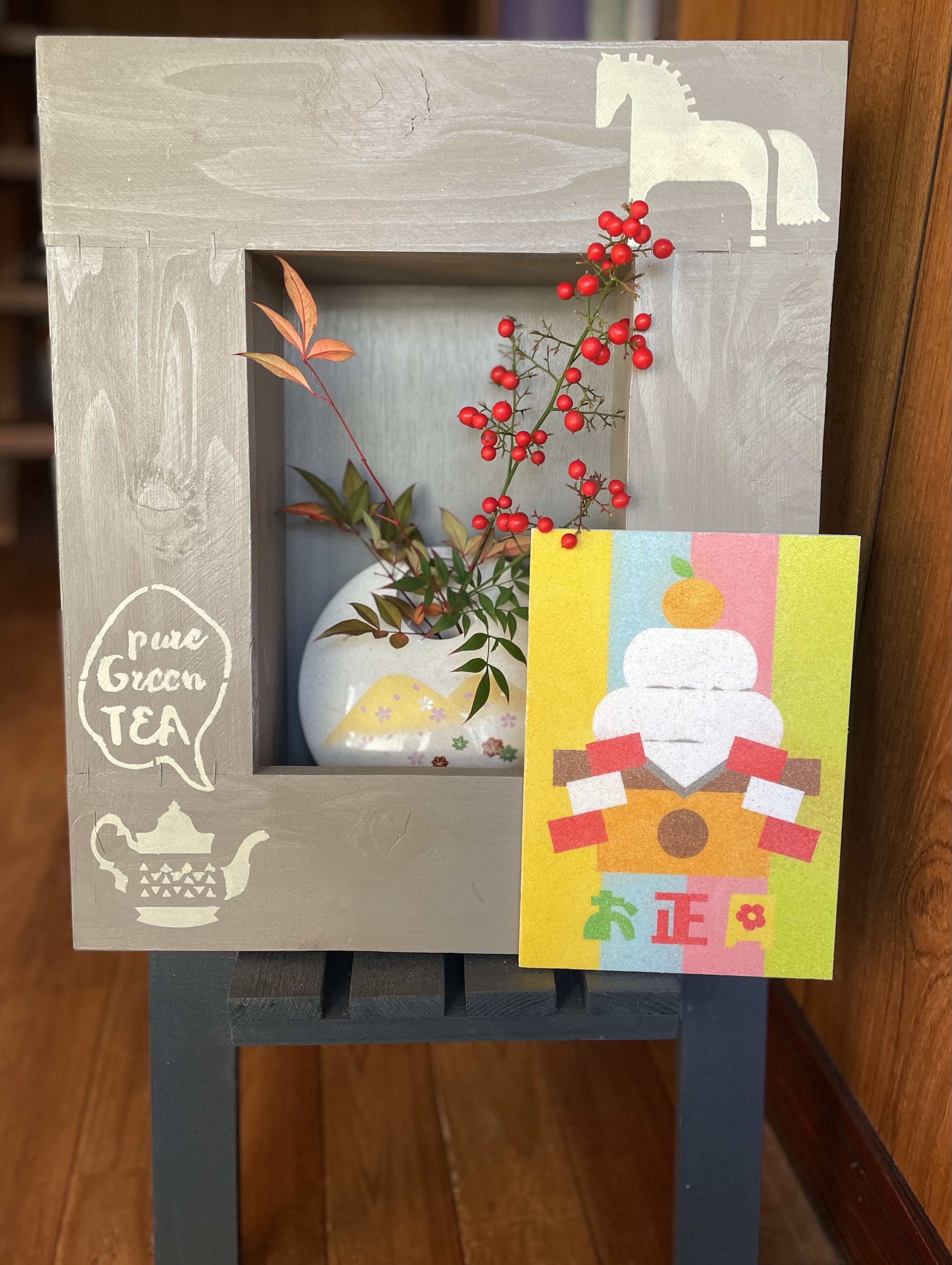 投稿を表示フラワーフレームの🐴と鏡餅の砂絵ボードと万両で準備は完璧ですね😆