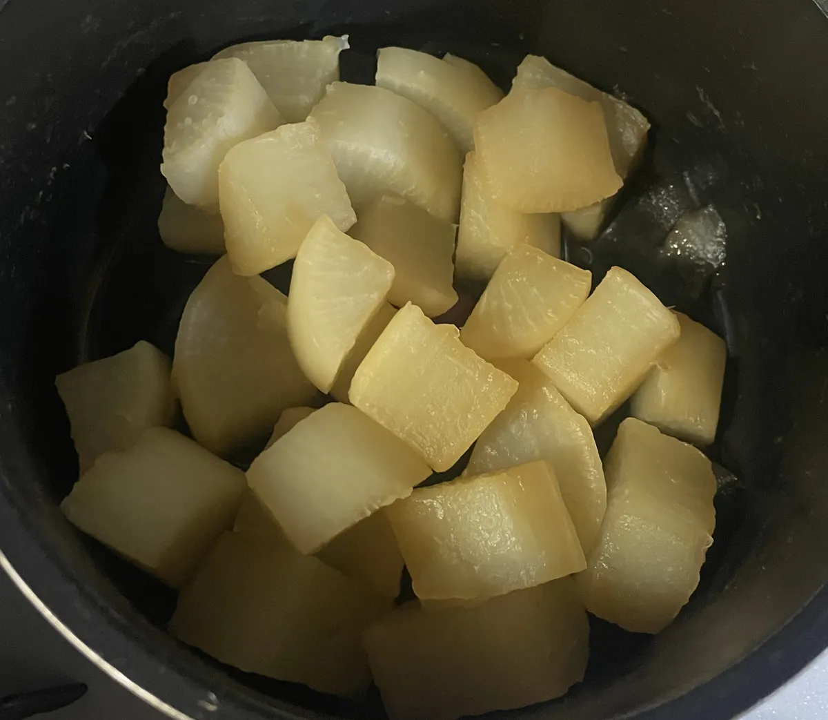 デカい輪切りのまま白く綺麗に煮るには米のとぎ汁やら圧力鍋出さないと出来んが⚪️🌾🍲💦