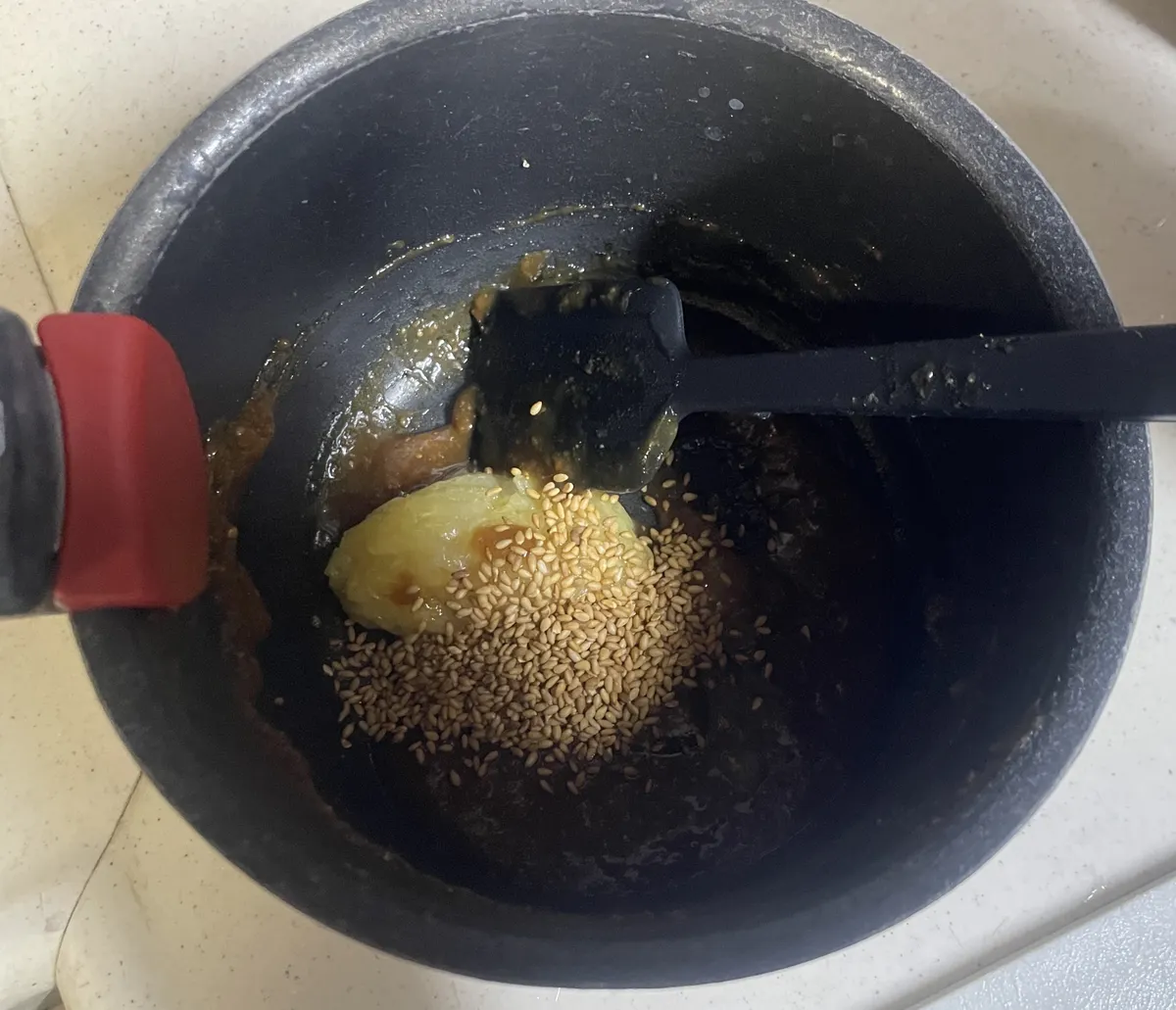 調味料(金胡麻・味噌以外)を加熱して程よく煮詰めたら、薄皮付き果肉・金胡麻・味噌を加えて更に煮るぅ〜🍲✨
