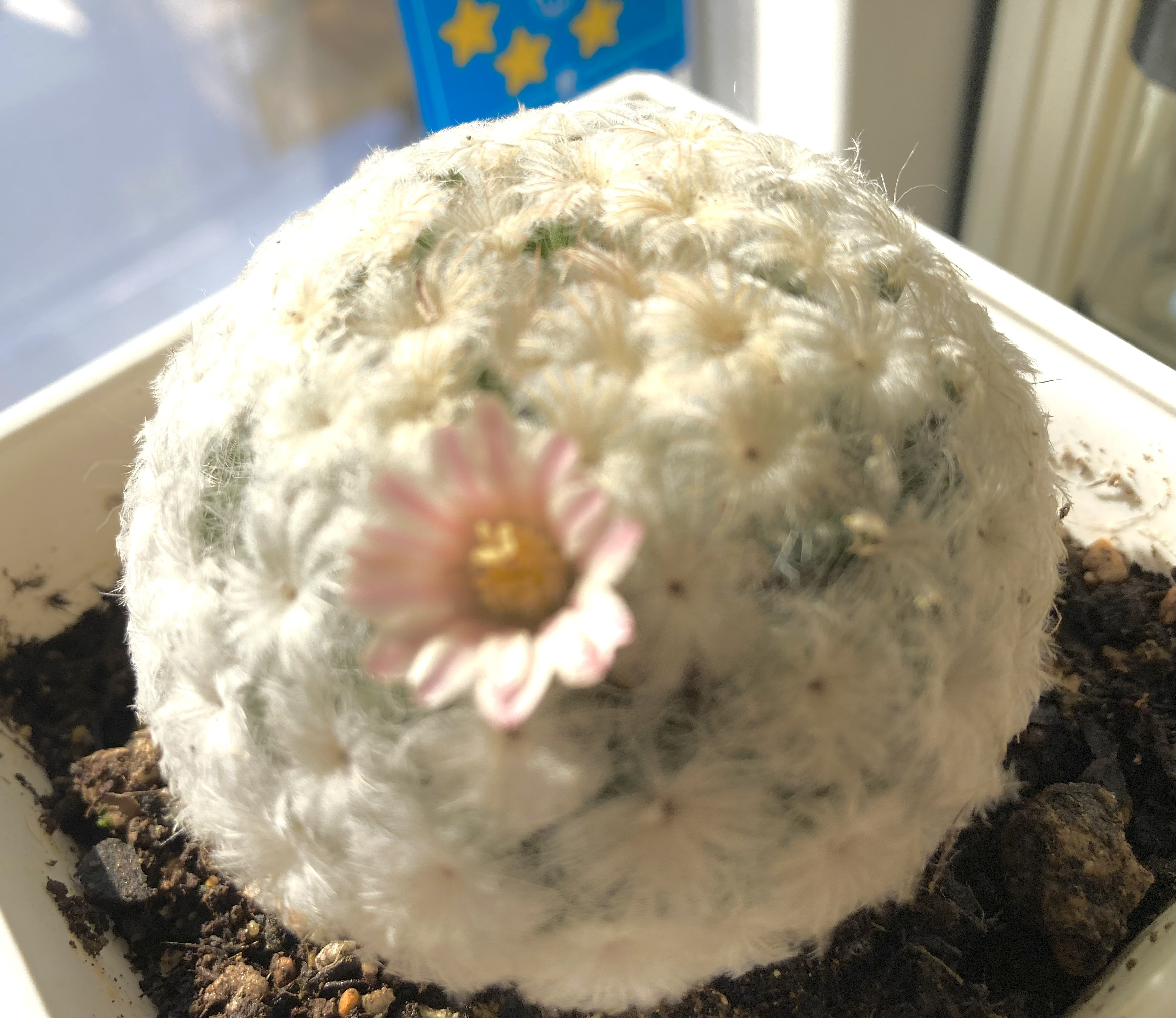 投稿を表示まん丸真っ白のサボテンちゃん可愛いですね🤍淡いピンクのお花も可愛いですね🩷