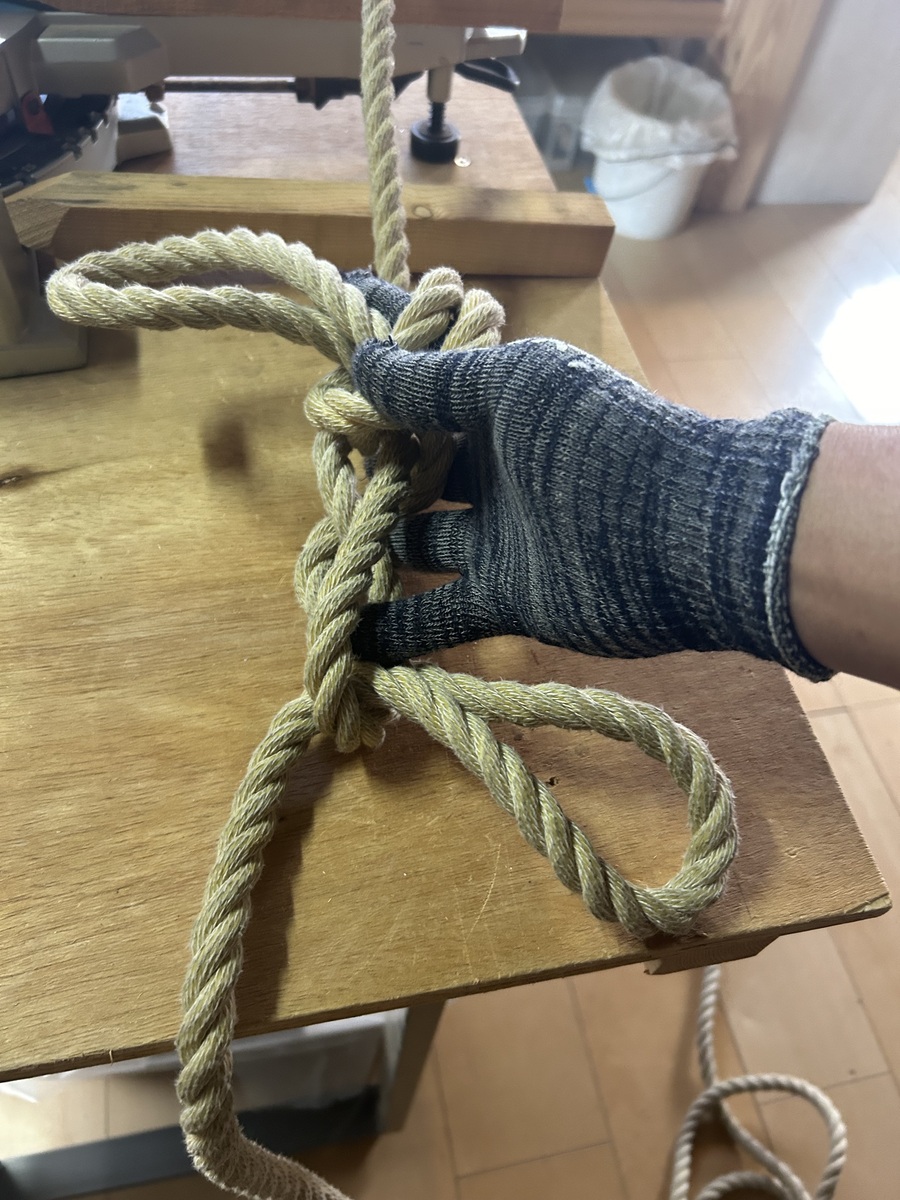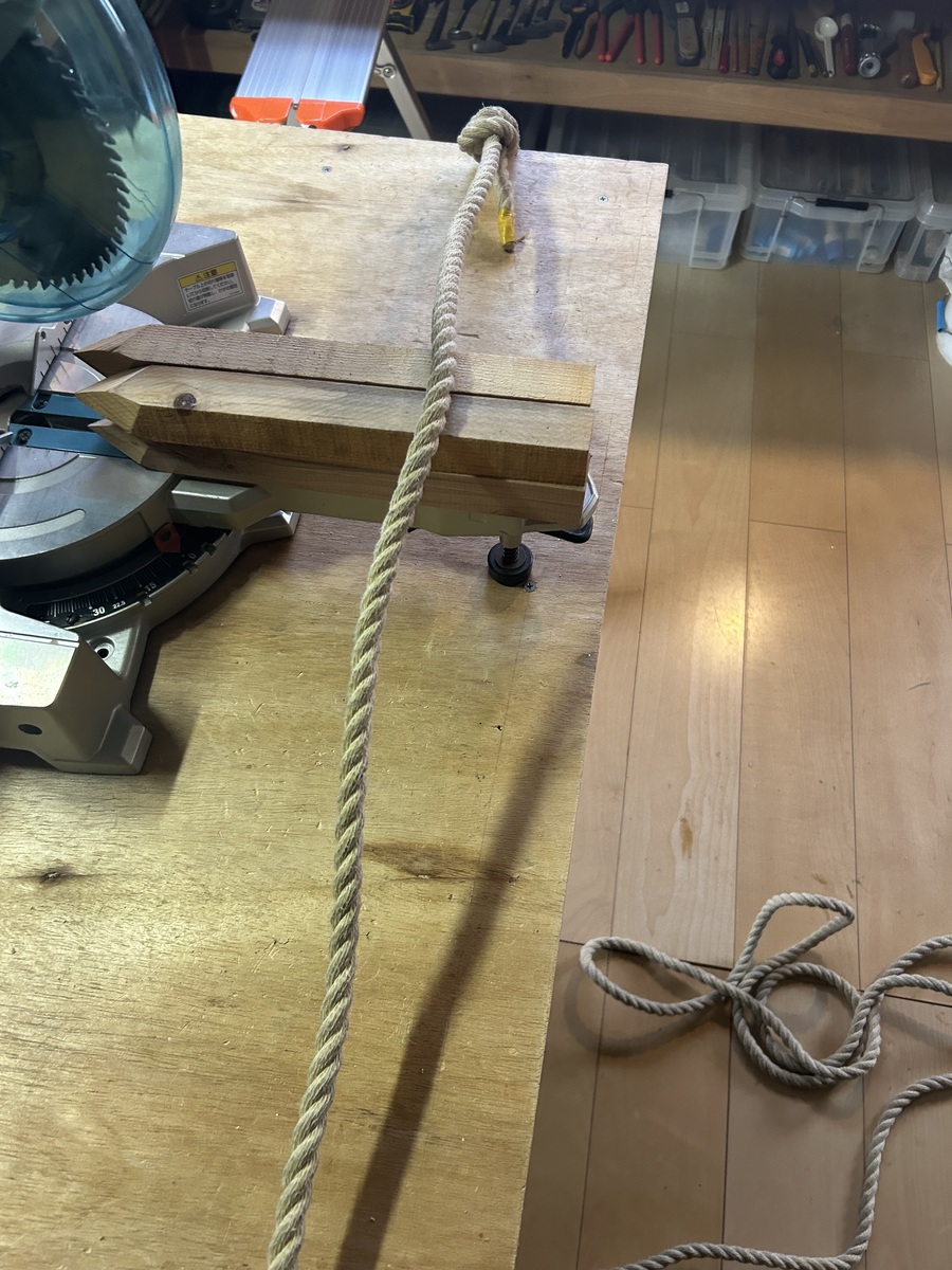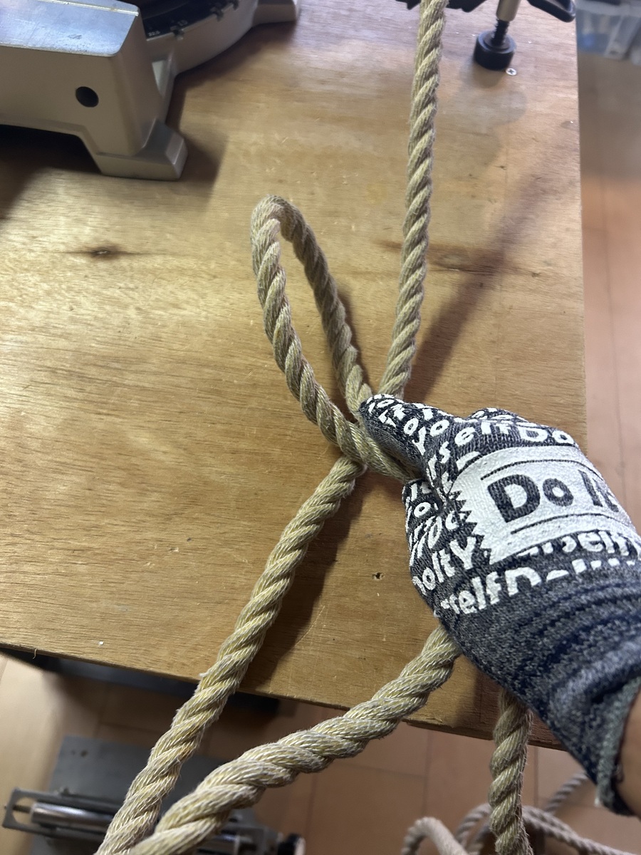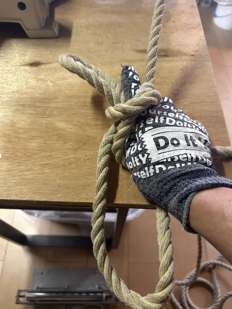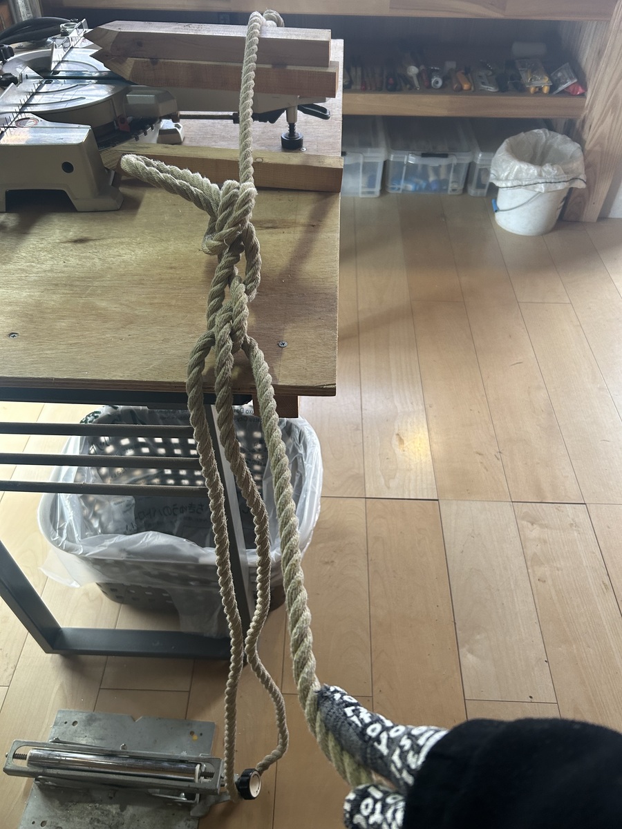 ロープは写真ぐらいの太さかやや細いぐらいが良いです。太いと結えづらく細いと切れやすいので。ホームセンターで買うことが出来、購入されたら片側に輪を作っておきます。