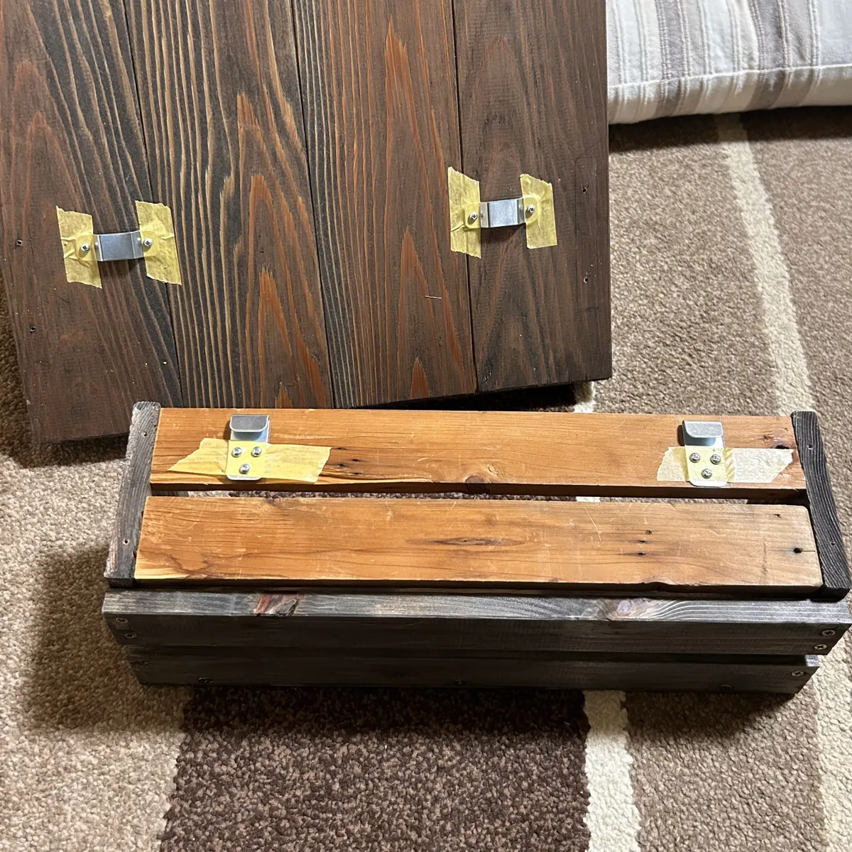 平行を見ながら吊り金具をマステで取り付けて。ズレないよう、マステの上からドリル、ビスつけをして。