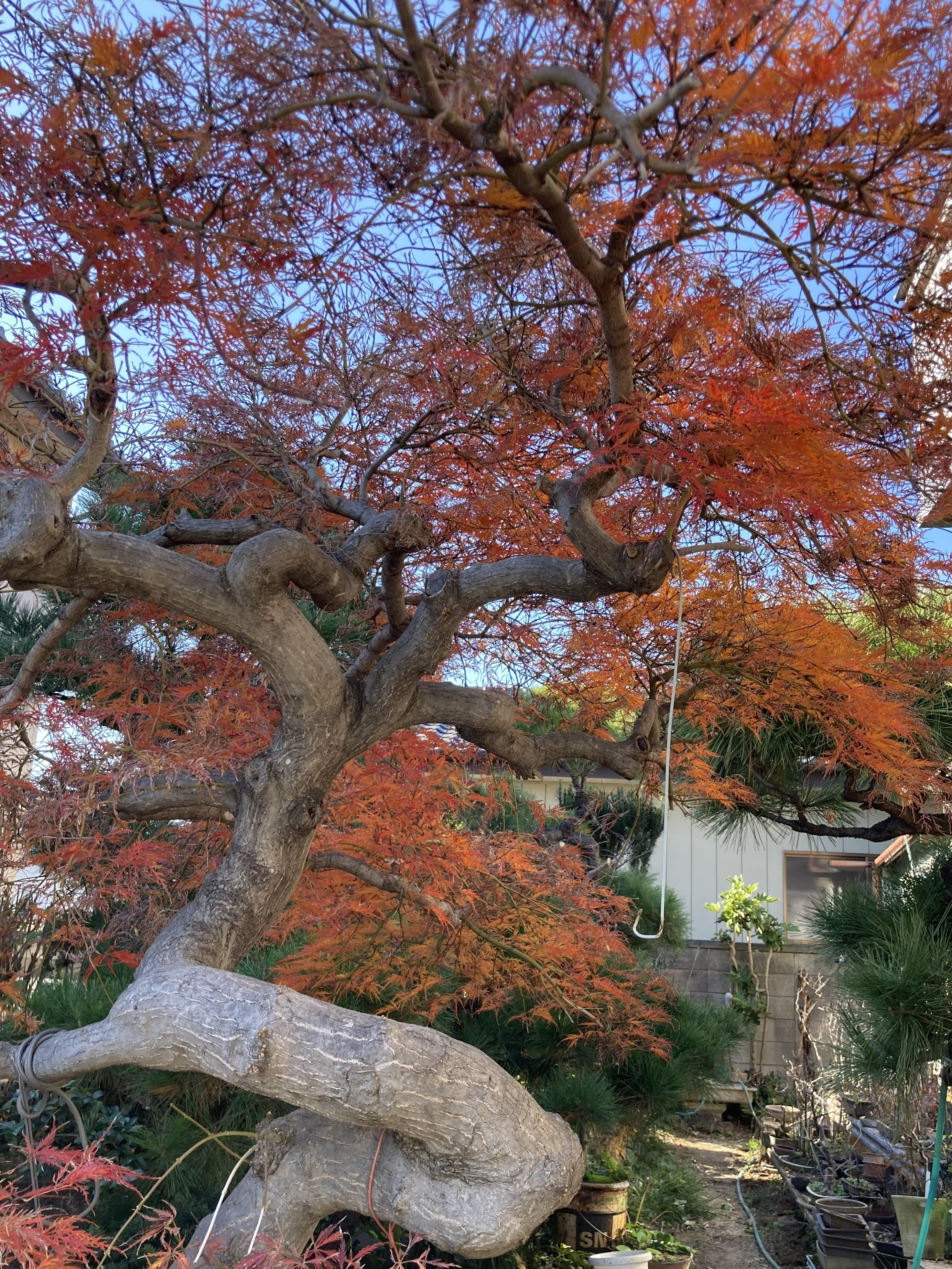 見事な木で紅葉も素晴らしいですね🍁幹の曲がり具合とか枝ぶりとか、そうなるように施したんですね、凄い😳愛着のある木ならお世話もしがいがありますが、松は困っちゃいますね💦業者は嫌…う〜ん、怪我でもしたらと考えるとそこまでにこだわる意味って、となりますね。他人に触られたくないってことなのかな🤔プロだと綺麗にしてくれそうに思いますが。やってくれる人がいるから、とかずんさん頼りなとこもあるのかなぁ。