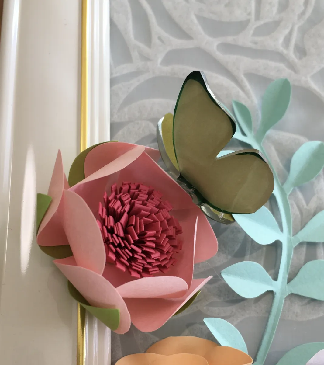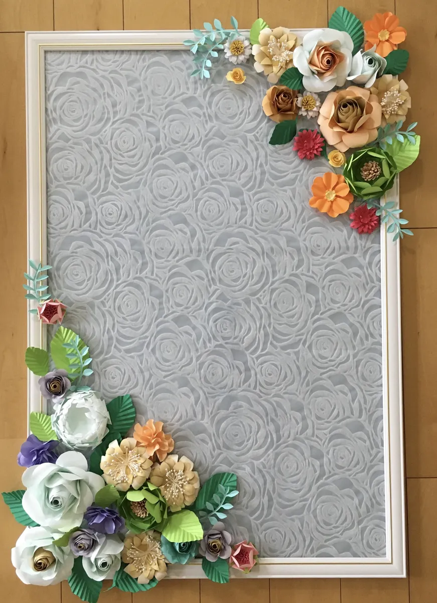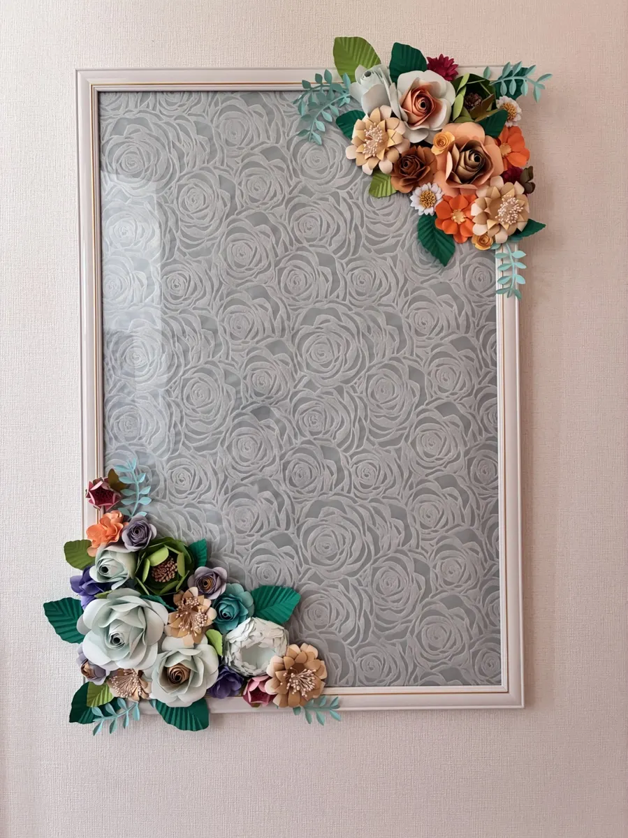 全て花や葉を作り、額縁の背板にバラ柄の不織布を貼り仮置きしてみます。