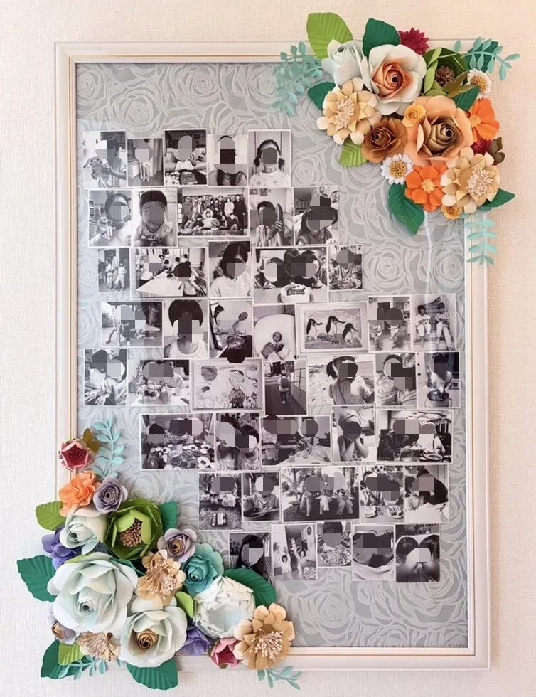 パーツをグルーガンで貼り付けて壁にかけて写真をどのように飾るか確認。