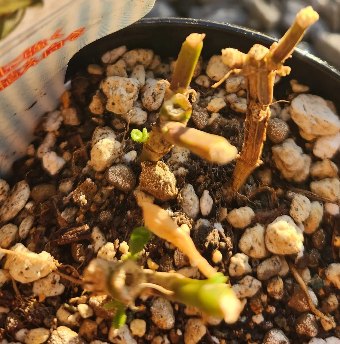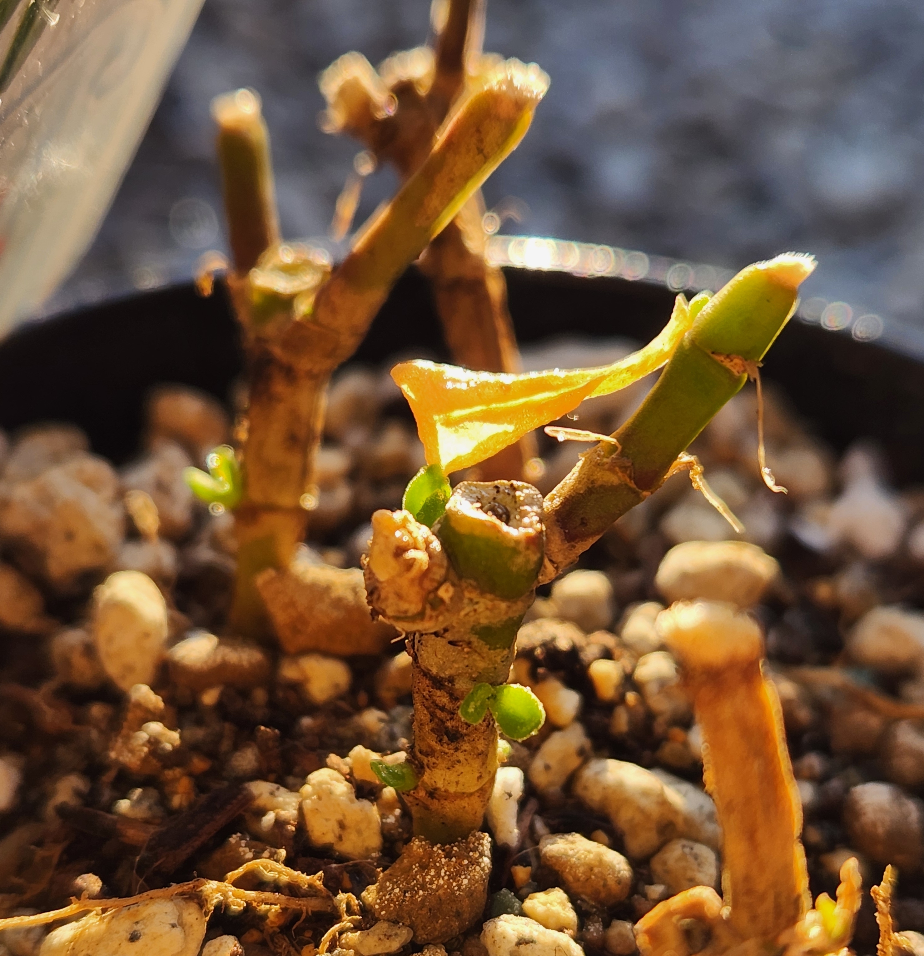 いたグリーンサンローズ。上の方は挿し芽にして下はダメ元で置いておいたら出てきてる~🎶