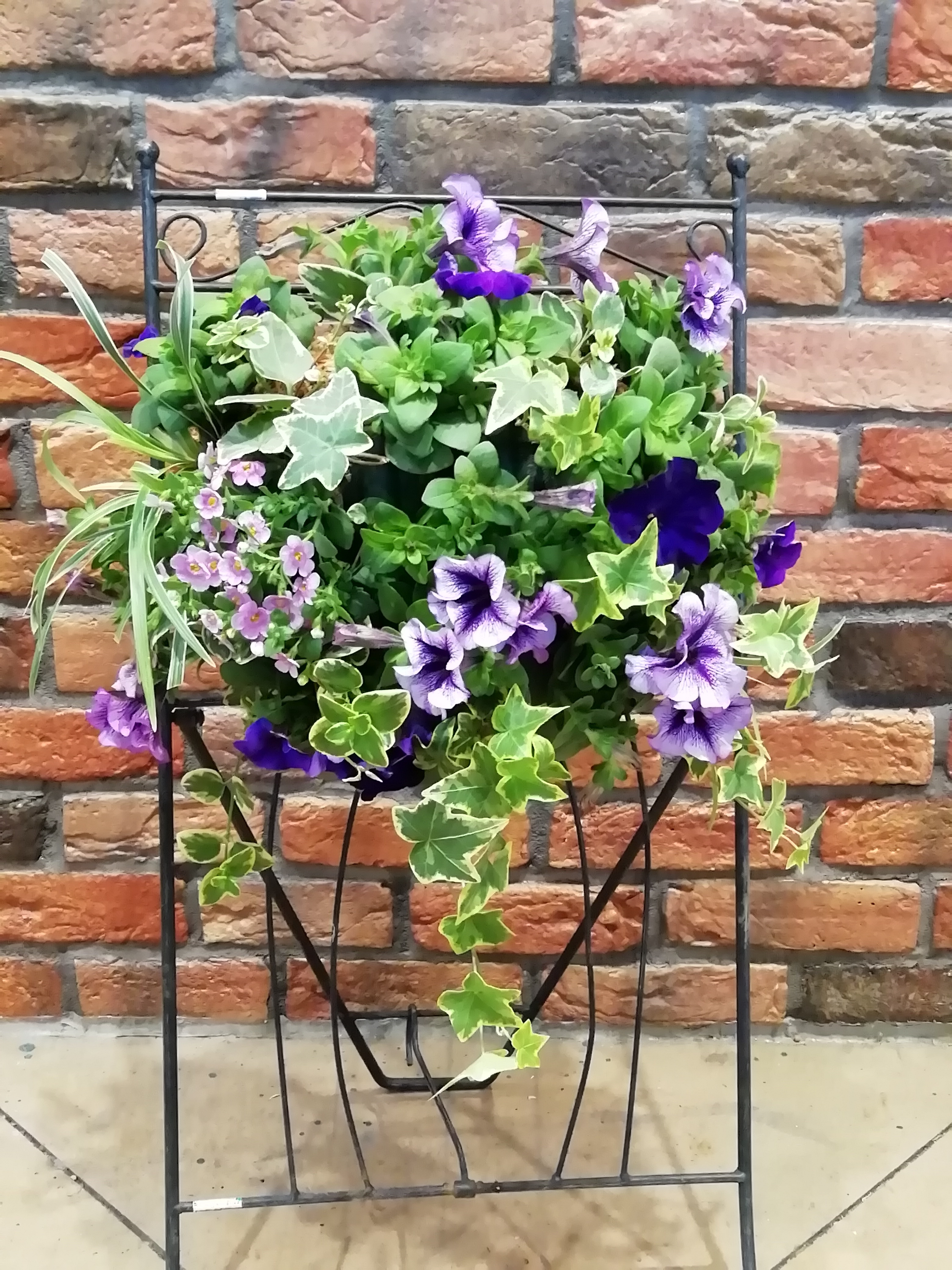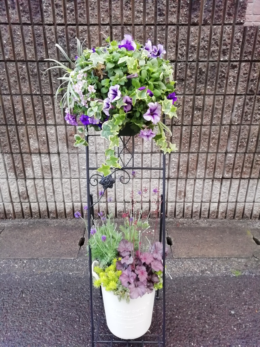 とても初めてのハンギングには見えません🩷 凄く素敵です😍✨💞。濃淡の紫💜のペチュニア、アクセントのバコパ、ツルニチニチソウなど綺麗に丸くまとまっていて、エレガントです✨🫶 寄せ植え1号ちゃんともぴったり🎶❣️ これから、もっともりもりになっていくのが楽しみですね。🥰(◕ᴗ◕✿)