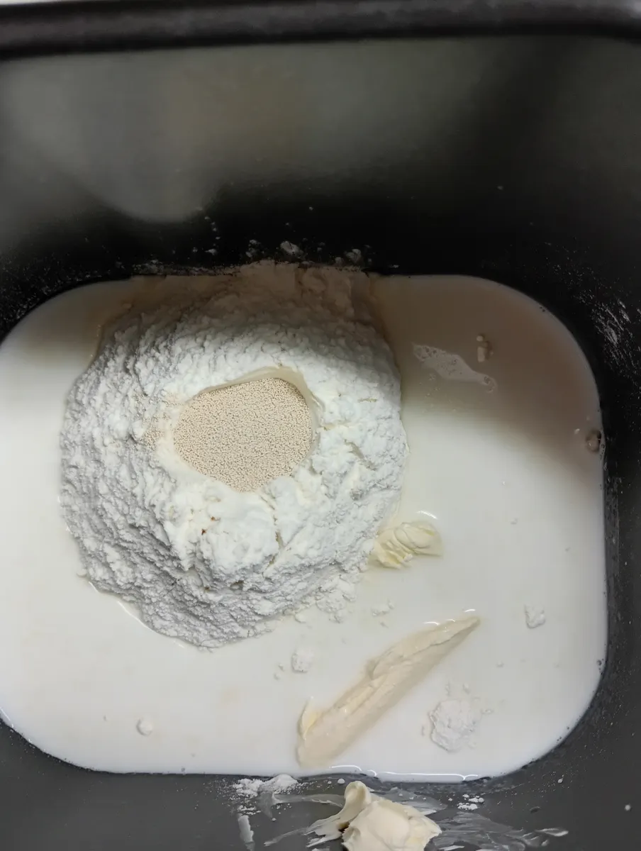1、材料をホームベーカリーに入れてパン生地コースでこねる(これで、一次発酵まで終わる)