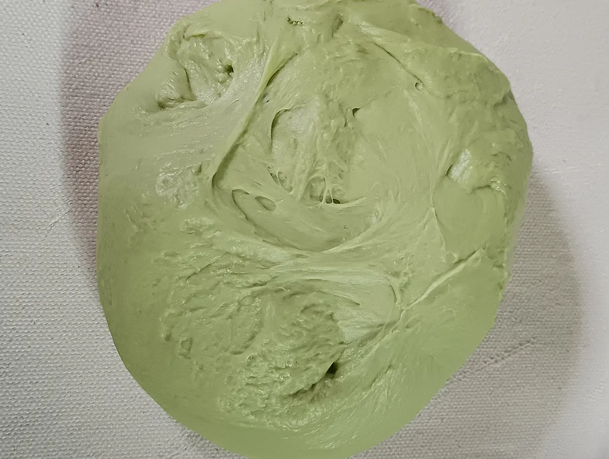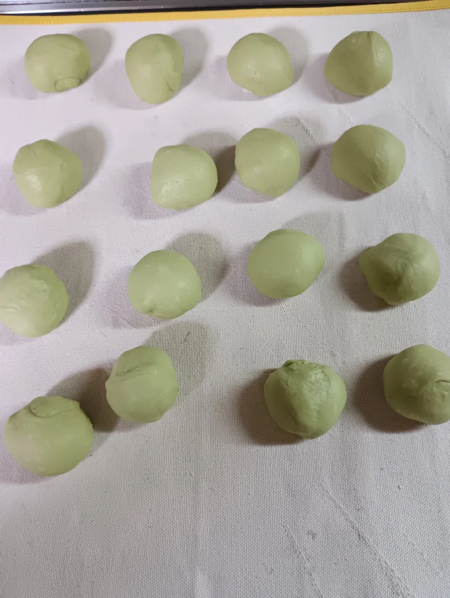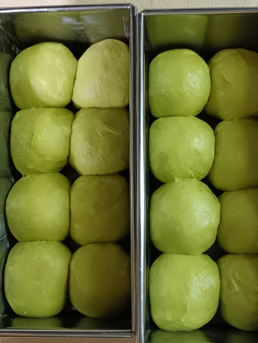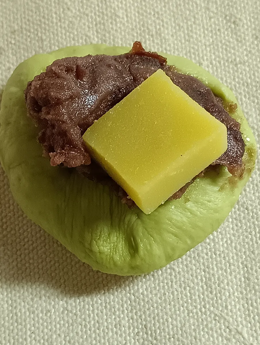 (今回の生地には、抹茶を適量使用しています、小さじ2杯~大さじ1杯程度、具には小倉あん、芋羊羹を大きめのサイコロにカットして包んでいます)