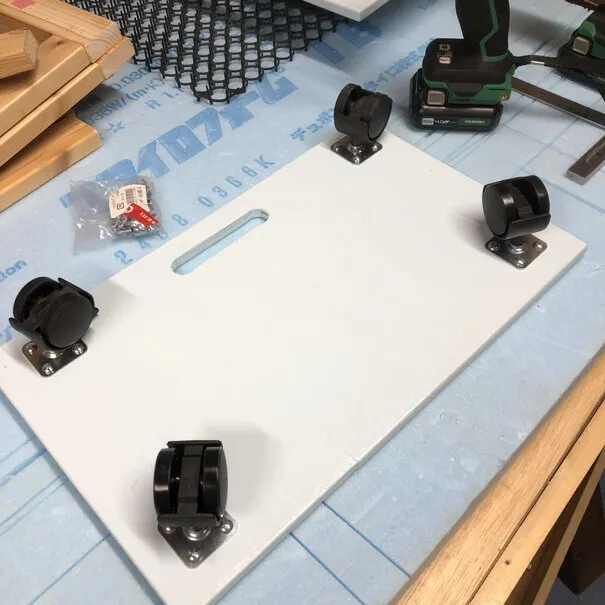 前後にしか移動できないキャスター(トランク内で動いてもらっては困る)、手前だけストッパー付きなど、キャスターの種類を変えて試行中です。