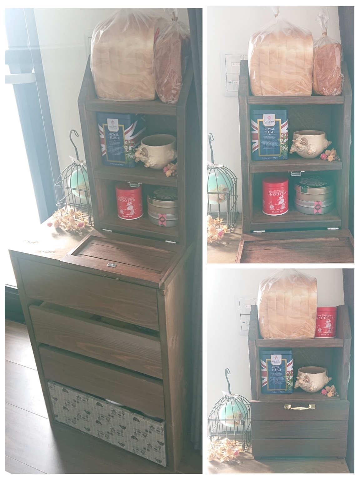 スパイスラックには🤗🍞☕🍵タイム関係のものを入れています♪1番上の棚はコンビニ食パンはもちろん🤭、よく行くベーカリーのいろんな種類やサイズの食パンも、ちょっと向きを変えれば、うれしいくらいにジャストフィット~🦦🎶してしまいます🤩👍️