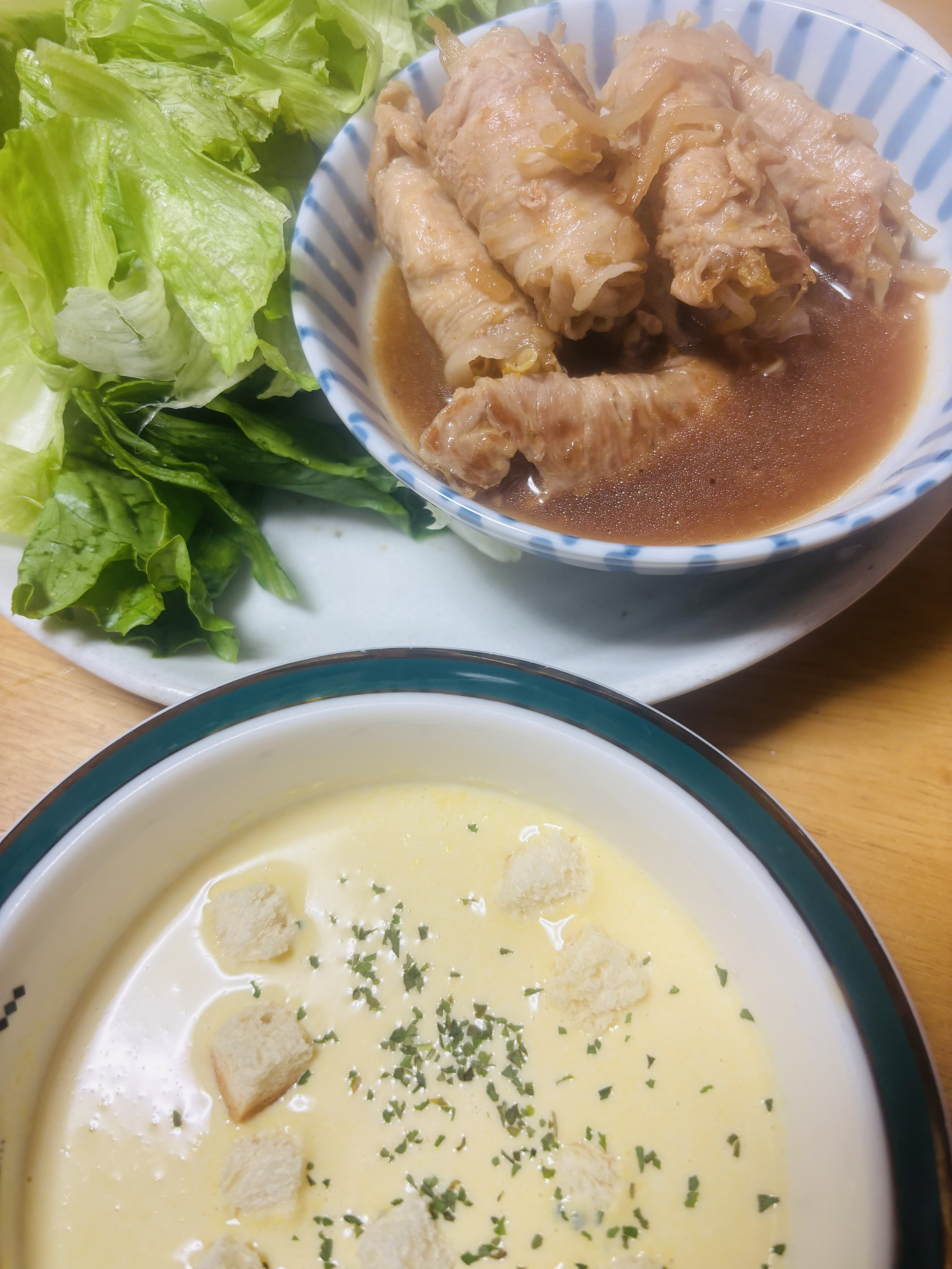 投稿を表示あったがスープと、肉巻き!十分夕飯のメインですね〜美味しそう😊