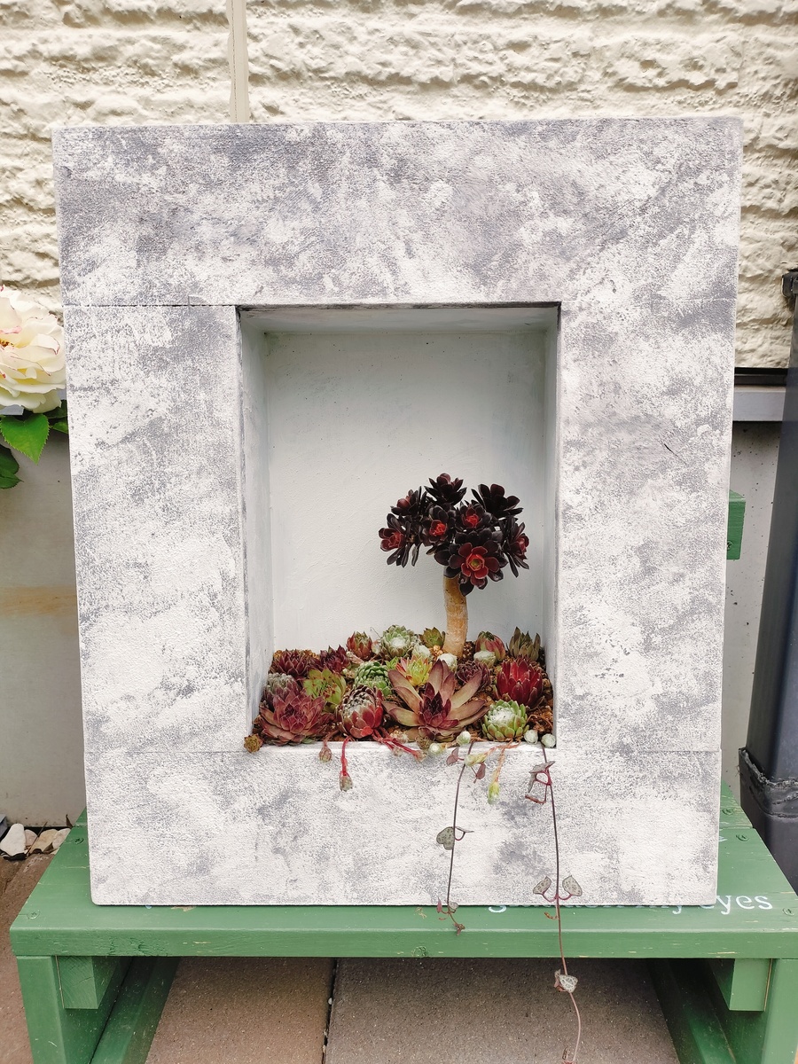 モルタル塗料のフラワーフレームの風合いに、可愛い寄せ植えが映えますね❣️