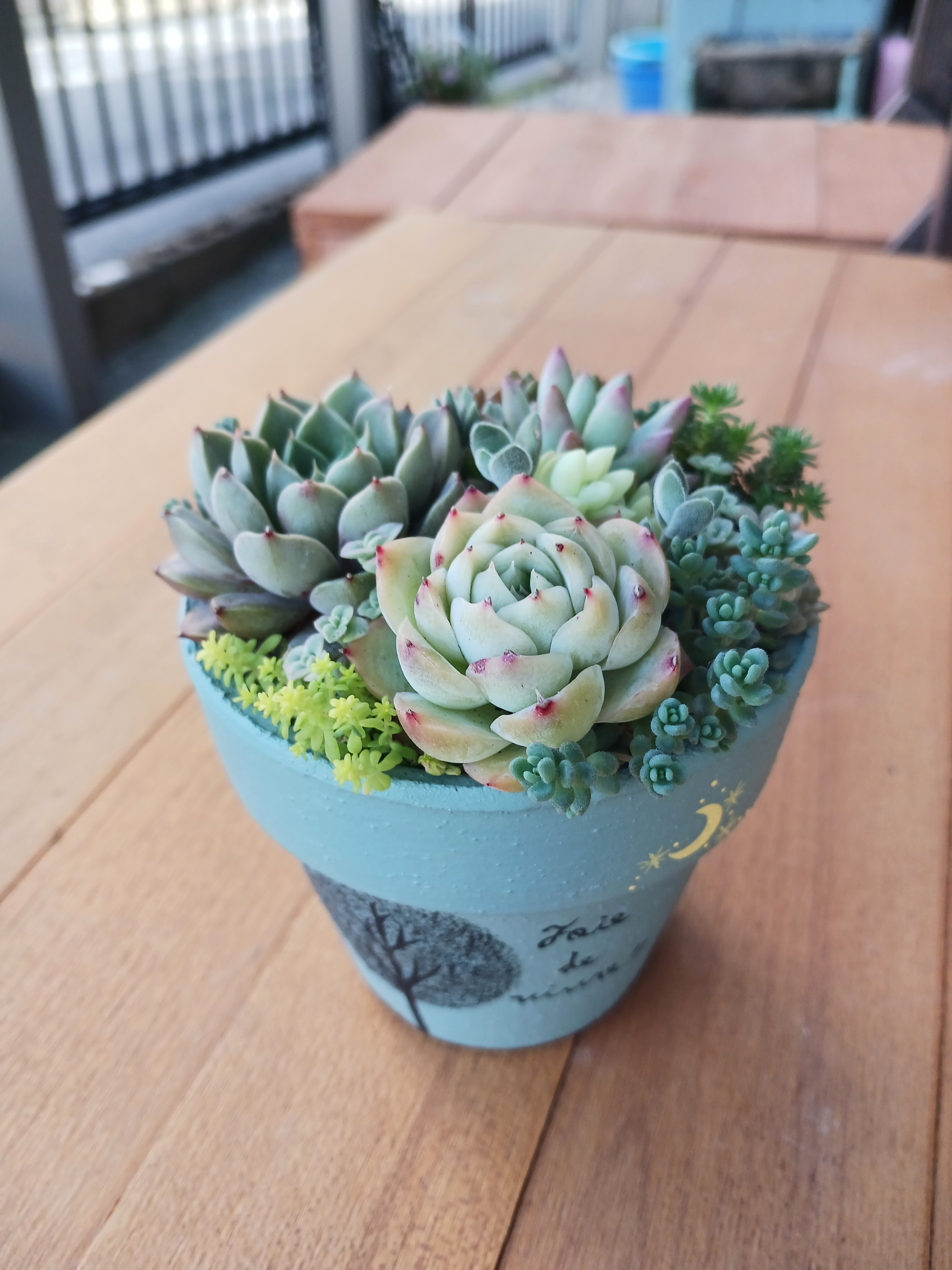 投稿を表示鉢に合わせて多肉の色を選んでいるので、綺麗にまとまって素敵な寄せ植えです♡