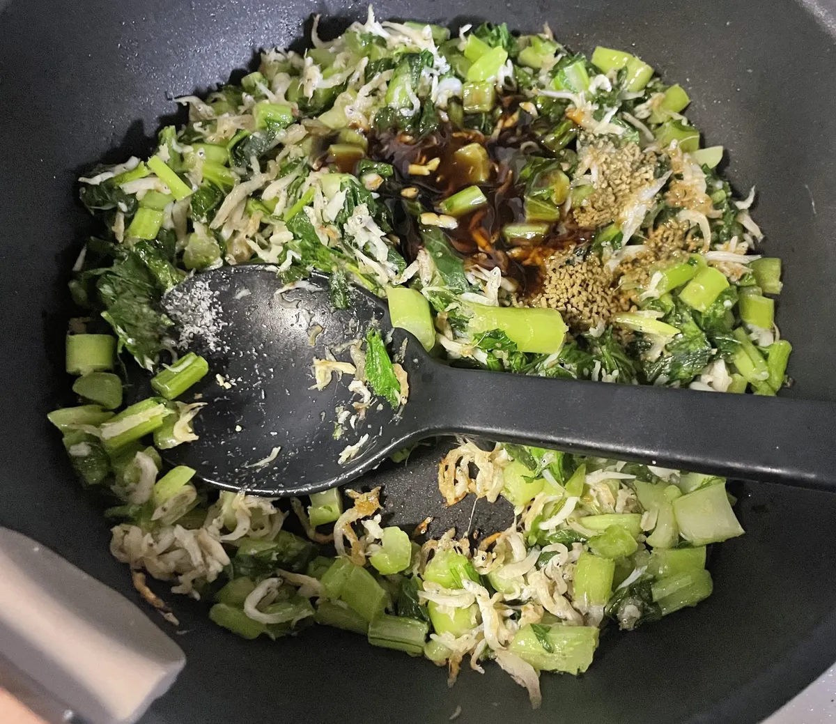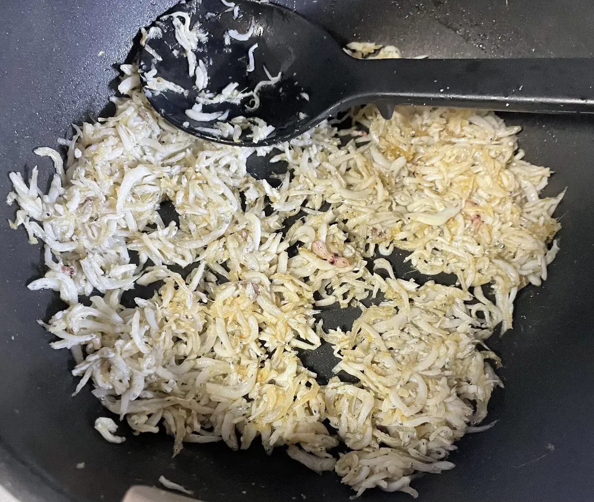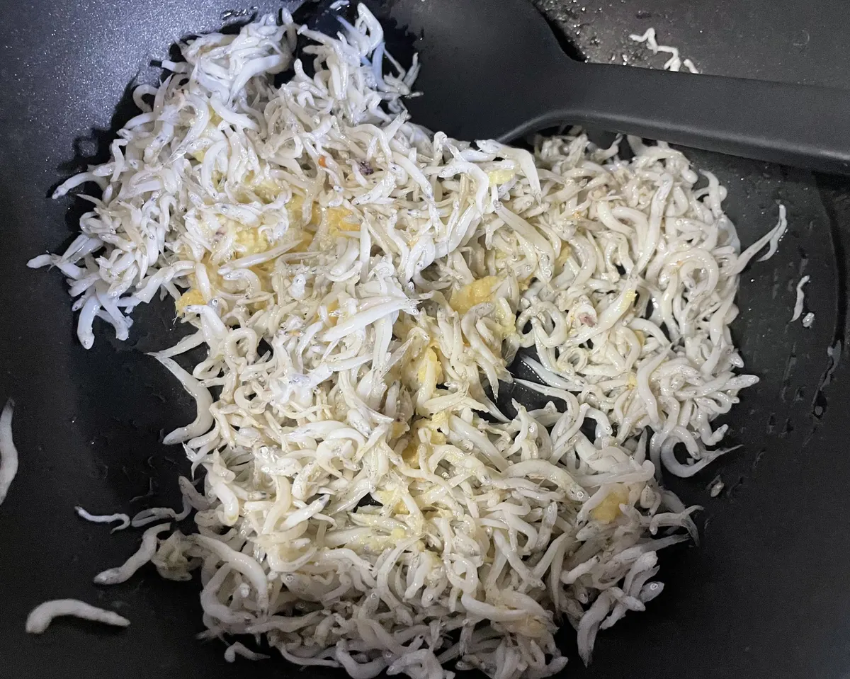 そんたら胡麻油垂らしたフライパンでシラス・生姜をチョイ焦げ目付く香ばしい感じに炒めてぇ〜🐟➰🍳🔥✨