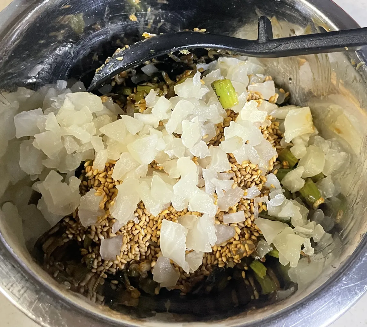 その後刻んでおいた糖漬大根・金胡麻加えて撹拌したらおじゃこと葉物のふりかけ出来上がりぃ〜😁👍🐟🌿☑️🥣✨