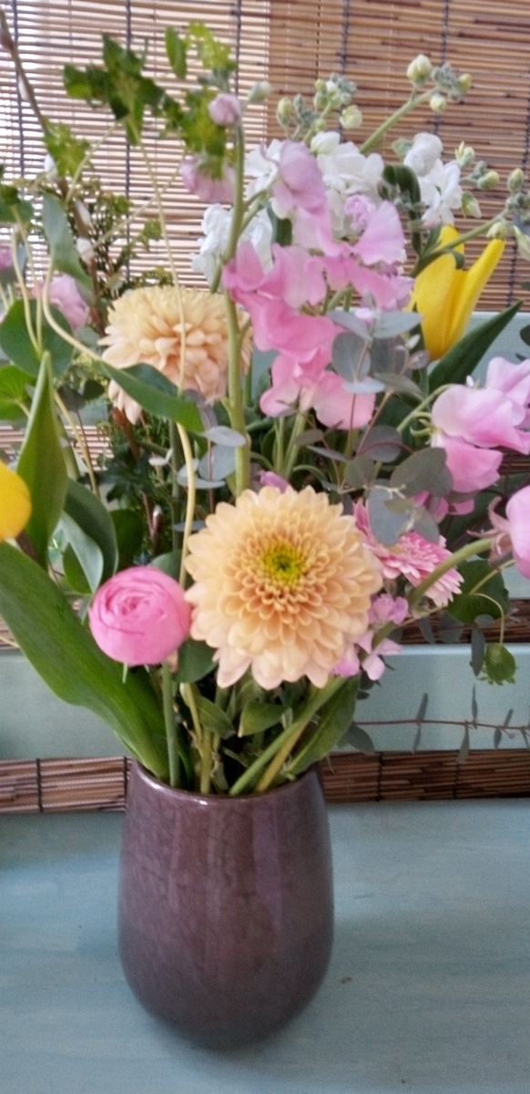 優しい色合いの花を花瓶の色が引き締めてオシャレですね✨✨✨